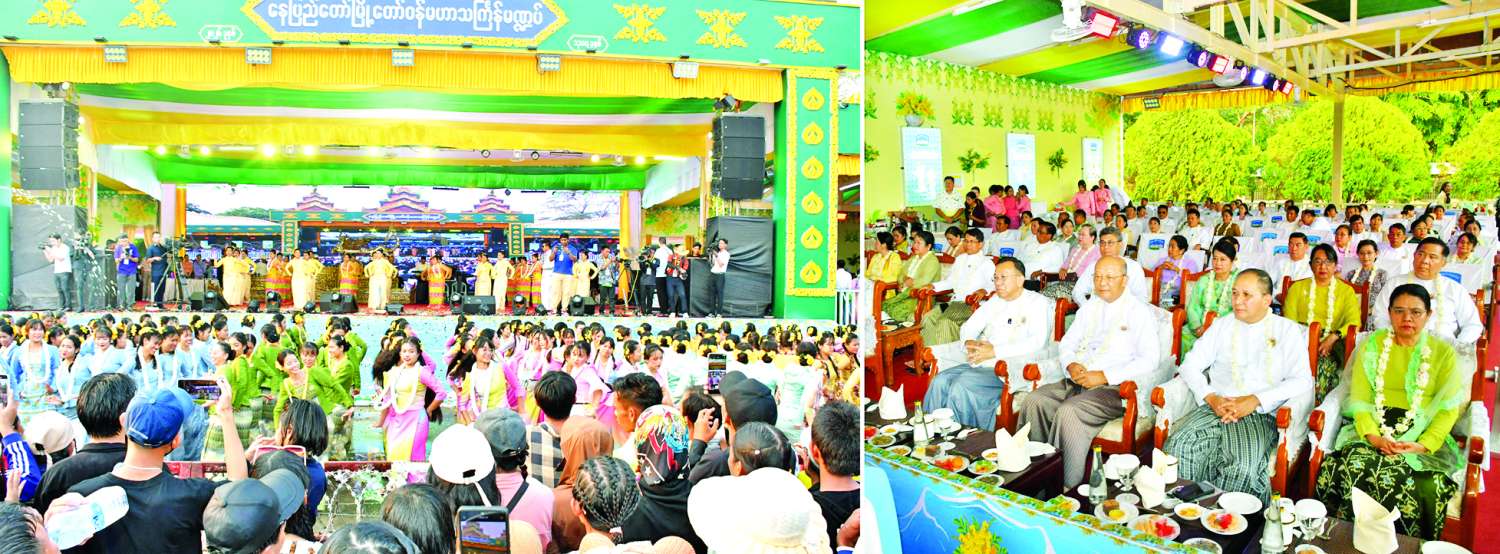 ထို့နောက် သင်္ကြန်ယိမ်းအဖွဲ့များက မန်းတောင်ရိပ်ခိုတေးသီချင်းဖြင့် စုပေါင်းကပြဖျော်ဖြေကြရာ အမျိုးသားလွှတ်တော်ဒုတိယဥက္ကဋ္ဌနှင့် နေပြည်တော်ကောင်စီဥက္ကဋ္ဌတို့က သပြေခက်ဖြင့် အတာရေပက်ဖျန်းပေးကြပြီး အခမ်းအနားကို ပိတ်သိမ်းလိုက်သည်။