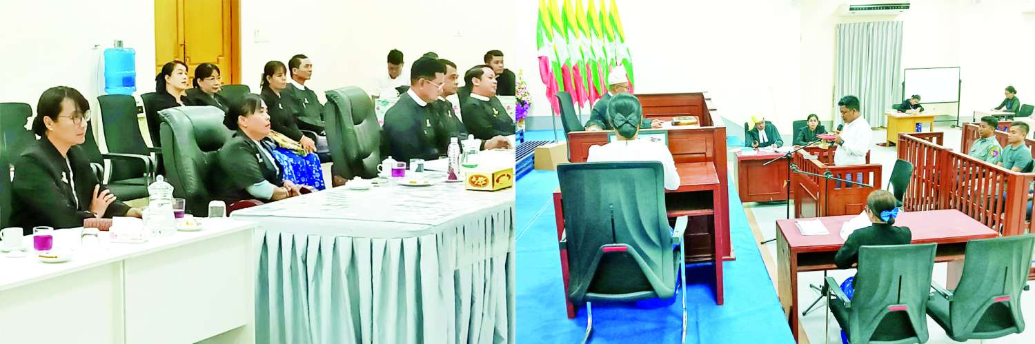 ကြည့်ရှုစစ်ဆေးစဉ် ပြည်ထောင်စုဝန်ကြီးနှင့် ပြည်ထောင်စုရှေ့နေချုပ်က နိုင်ငံသားတိုင်းဥပဒေ၏ အကာအကွယ်ကို အညီအမျှရရှိစေရန်၊ မှားယွင်းပြီး အပြစ်စီရင်ခြင်းမခံရစေရန်၊ ပြစ်မှုနှင့် ပြစ်ဒဏ်မျှတပြီး တိတိကျကျ မှန်မှန်ကန်ကန် မြန်မြန်ဆန်ဆန် စီရင်နိုင်စေရန်၊ တရားရုံးများ ဖြောင့်မတ်မှန်ကန်စေရေး ဦးစားပေးဖော်ဆောင်သွားမည်ဖြစ်ကြောင်း လမ်းညွှန်ချက်နှင့်အညီ ဥပဒေရေးရာဝန်ကြီးဌာနအနေဖြင့် ရွေးချယ်ခန့်ထားပြီးသော အစမ်းခန့်ဥပဒေအရာရှိ အသစ်များကို လုပ်ငန်းခွင်ဝင် သင်တန်းများပေးခြင်းကို ပြည်ထောင်စုရှေ့နေချုပ်ဥပဒေ၊ နည်းဥပဒေများနှင့်အညီ ပို့ချပေးလျက်ရှိကြောင်း၊ ယခုလုပ်ငန်းခွင် ဝင်သင်တန်းတွင် သရုပ်ပြတရားရုံး (Mock Court) လေ့ကျင့်သင်ကြားပေးခြင်းဖြင့် ဥပဒေအရာရှိများ၏ လုပ်ငန်းတာဝန်များကို ကောင်းမွန်စွာဆောင်ရွက်နိုင်ရန်၊ မျိုးဆက်သစ် ဥပဒေအရာရှိများအား တရားခွင်နှင့် ရင်နှီးကျွမ်းဝင်စေရန်၊ အတွေ့အကြုံရှိသော ဥပဒေအရာရှိများက မျိုးဆက်သစ်ဥပဒေ အရာရှိများအား ဥပဒေဆိုင်ရာအသိပညာများ လက်ဆင့်ကမ်းဖြန့်ဝေပေးသကဲ့သို့ နောင်တွင် မျိုးဆက်သစ်ဥပဒေအရာရှိများ ကိုယ်တိုင်ဥပဒေအသိပညာများကို လက်ဆင့်ကမ်းဖြန့်ဝေခြင်းဖြင့် နိုင်ငံသားတိုင်းဥပဒေ၏ အကာအကွယ် အညီအမျှရရှိစေရေး ပိုမိုထိရောက်အောင် ဆောင်ရွက်နိုင်မည်ဖြစ်ကြောင်းမှာကြားသည်။