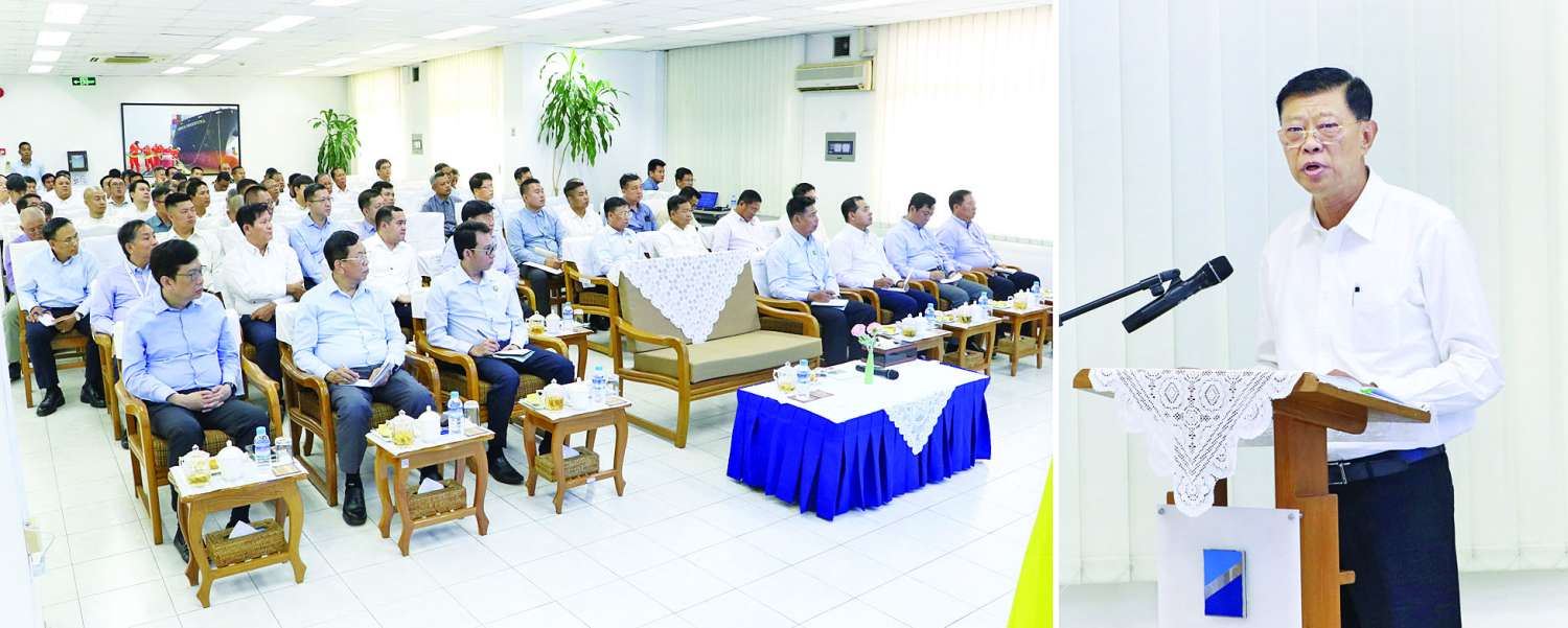 ယင်းနောက် ပြည်ထောင်စုဝန်ကြီးက မြန်မာနိုင်ငံ၏ နှစ်စဉ်ပင်လယ်ရေကြောင်းဖြင့် ကုန်သွယ်မှုတန်ဖိုးသည် နိုင်ငံတကာကုန်သွယ်မှုတန်ဖိုး၏ ပျမ်းမျှ ၇၀ ရာနှုန်းရှိသဖြင့် ပင်လယ်ရေကြောင်းဖြင့် ကုန်သွယ်မှု၏ အဓိက ဝင်/ထွက်ပေါက်ဖြစ်သော ရန်ကုန်နှင့် သီလဝါဧရိယာရှိ ဆိပ်ကမ်းတံတားများအပါအဝင် ဆိပ်ကမ်းလုပ်ငန်းကဏ္ဍတစ်ခုလုံး စဉ်ဆက်မပြတ်ဖွံ့ဖြိုးတိုးတက်ရေးအတွက် အစိုးရ-ပုဂ္ဂလိကပူးပေါင်းဆောင်ရွက်မှုကို အလေးထားဆောင်ရွက်ကြရန်လိုကြောင်း၊ ရန်ကုန်ဆိပ်ကမ်း၏ ကုန်ကိုင်တွယ်ရရှိမှု ပမာဏကိုမြှင့်တင်နိုင်ရန် ပြည်တွင်းလိုအပ်ချက်ကို ဖြည့်ဆည်းပေးခြင်းအပြင် နိုင်ငံ၏ မဟာဗျူဟာမြောက် ပထဝီဝင်အနေအထားကို အကျိုးရှိစွာအသုံးချပြီး အိမ်နီးချင်းနိုင်ငံများ၏ ပို့ကုန်/သွင်းကုန်များကိုပါ သယ်ယူပို့ဆောင်ပေးနိုင်မည့် ကုန်း-ရေနှစ်သွယ် ဘက်စုံသယ်ယူပို့ဆောင်ရေးစနစ်ကို အကောင်အထည်ဖော်ရန်လိုကြောင်း၊ ထို့ကြောင့် ရန်ကုန်ဆိပ်ကမ်းမှတစ်ဆင့် ရေယာဉ်လွှဲပြောင်းတင်ဆောင်ခြင်း (Trans-shipment) ဝန်ဆောင်မှုနှင့် နိုင်ငံဖြတ်သန်းကုန်သွယ်မှု (Transit Trade) ဝန်ဆောင်မှုများကို ပေးနိုင်ရန် အဆင်သင့်ဖြစ်မှုအတွက် ဆိပ်ကမ်းတံတားများကို ဆက်လက်တိုးချဲ့တည်ဆောက်လုပ်ကိုင်ကြရန် လိုအပ်ပြီး နိုင်ငံ၏ စွမ်းအင်လုံခြုံမှုအတွက်လည်း စက်သုံးဆီတံတားများနှင့် သိုလှောင်ကန်များကို မြေနေရာချထားပေးပြီးဖြစ်သည့် ပုဂ္ဂလိကလုပ်ငန်းရှင်များက ဆက်လက်ရင်းနှီးမြှုပ်နှံ တည်ဆောက်လုပ်ကိုင်ကြရန်၊ ဆိပ်ကမ်းလုပ်ငန်းစွမ်းဆောင်မှုကို မြှင့်တင်နိုင်ရေးအတွက် ဒီဂျစ်တယ်စနစ်ဖြင့် အသွင်ကူးပြောင်းဆောင်ရွက်ကြရန်၊ စွမ်းအင်သုံးစွဲမှုလျှော့ချနိုင်ရေးအတွက် ဆိုလာစနစ်ကို အစားထိုးသုံးစွဲကြရန်နှင့် ဘက်ထရီစနစ်သုံးကုန်ကိုင်တွယ်စက်ကိရိယာများနှင့် ယာဉ်များကို ပြောင်းလဲအသုံးပြုကြရန် တိုက်တွန်းပြောကြားသည်။