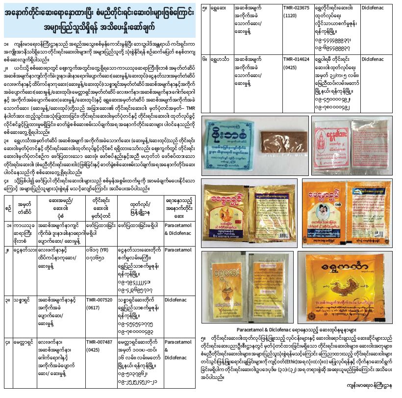 အနောက်တိုင်းဆေးရောနှောထားပြီး စံမညီတိုင်းရင်းဆေးဝါးများဖြစ်ကြောင်း အများပြည်သူသိရှိရန် အသိပေးနှိုးဆော်ချက်