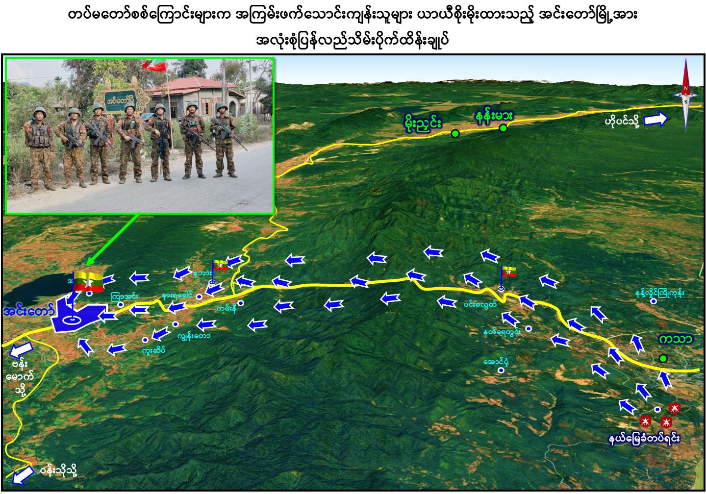 တပ်မတော်စစ်ကြောင်းများက အကြမ်းဖက်သောင်းကျန်းသူပူးပေါင်းအဖွဲ့များ ယာယီစိုးမိုးထားသည့် အင်းတော်မြို့နှင့် အဆိုပါဒေသတစ်ဝိုက်အား အလုံးစုံပြန်လည်သိမ်းပိုက်ထိန်းချုပ်