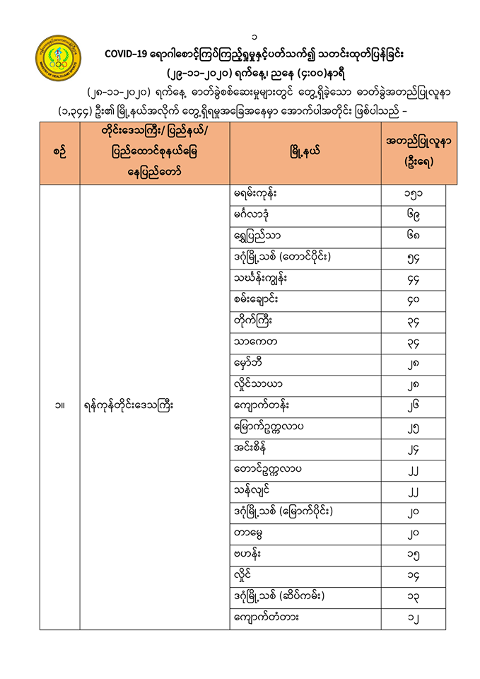 (၂၈-၁၁-၂၀၂၀) ရက်နေ့ ဓာတ်ခွဲစစ်ဆေးမှုများတွင် တွေ့ရှိခဲ့သော ဓာတ်ခွဲအတည်ပြုလူနာ (၁,၃၄၄) ဦး၏ မြို့နယ်အလိုက် တွေ့ရှိရမှုအခြေအနေမှာ အောက်ပါအတိုင်း ဖြစ်ပါသည်။
