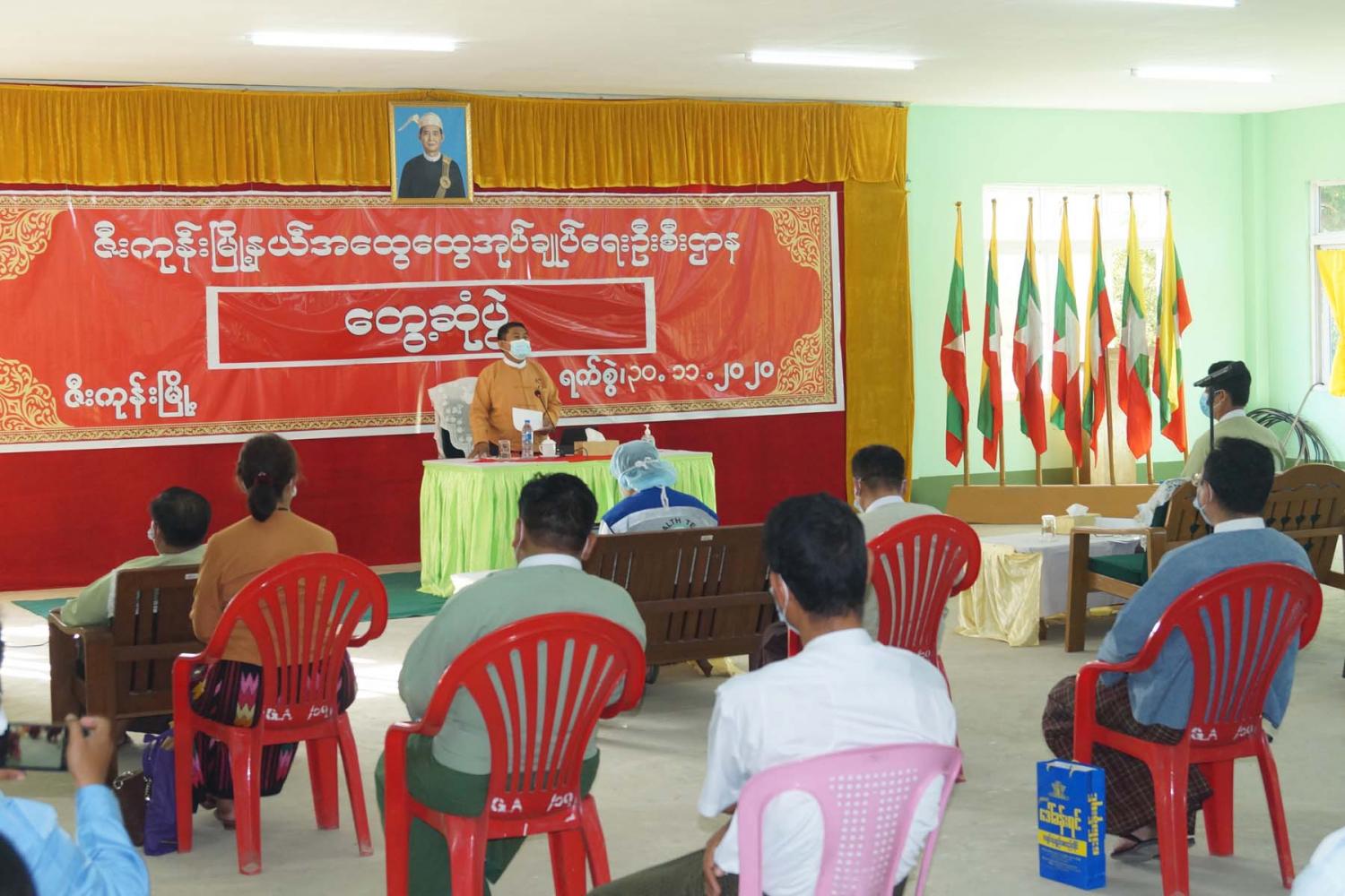 ထို့နောက် မြို့နယ်ကိုဗစ် -၁၉ ရောဂါထိန်းချုပ်ရေးနှင့် အရေးပေါ်တုံ့ပြန်ရေးကော်မတီဉက္ကဌ ဦးဝင်းမြင့်နှင့် မြို့နယ်ကျန်းမာရေး ဦးစီးမှူး ဒေါက်တာဇော်နိုင်ဦးတို့မှ မြို့နယ်အတွင်း ကိုဗစ်-၁၉ ရောဂါကူးစက်မှုအခြေအနေနှင့် ကာကွယ်ထိန်းချုပ်ရေးလုပ်ငန်း ဆောင်ရွက်ထားရှိမှုများကို တင်ပြဆွေးနွေးခဲ့ရာ ဝန်ကြီးချုပ်က ဆွေးနွေးတင်ပြချက်များအပေါ် လမ်းညွှန်မှာကြားခဲ့သည်။ ဆက်လက်၍ ကိုဗစ်ရောဂါ ကာကွယ်ရေးလုပ်ငန်းများတွင် အသုံးပြုရန် ငွေကျပ်(၅)သိန်းနှင့် နှာခေါင်းစည်း(၁၀၀၀)အား ပေးအပ်ရာ မြို့နယ်ကိုဗစ်-၁၉ ထိန်းချုပ်ရေးနှင့် အရေးပေါ်တုံ့ပြန်ရေး ကော်မတီ ဥက္ကဌ နှင့် ကျန်းမာရေးဦးစီးမှူးတို့က လက်ခံရယူခဲ့ကြကြောင်း သိရသည်။