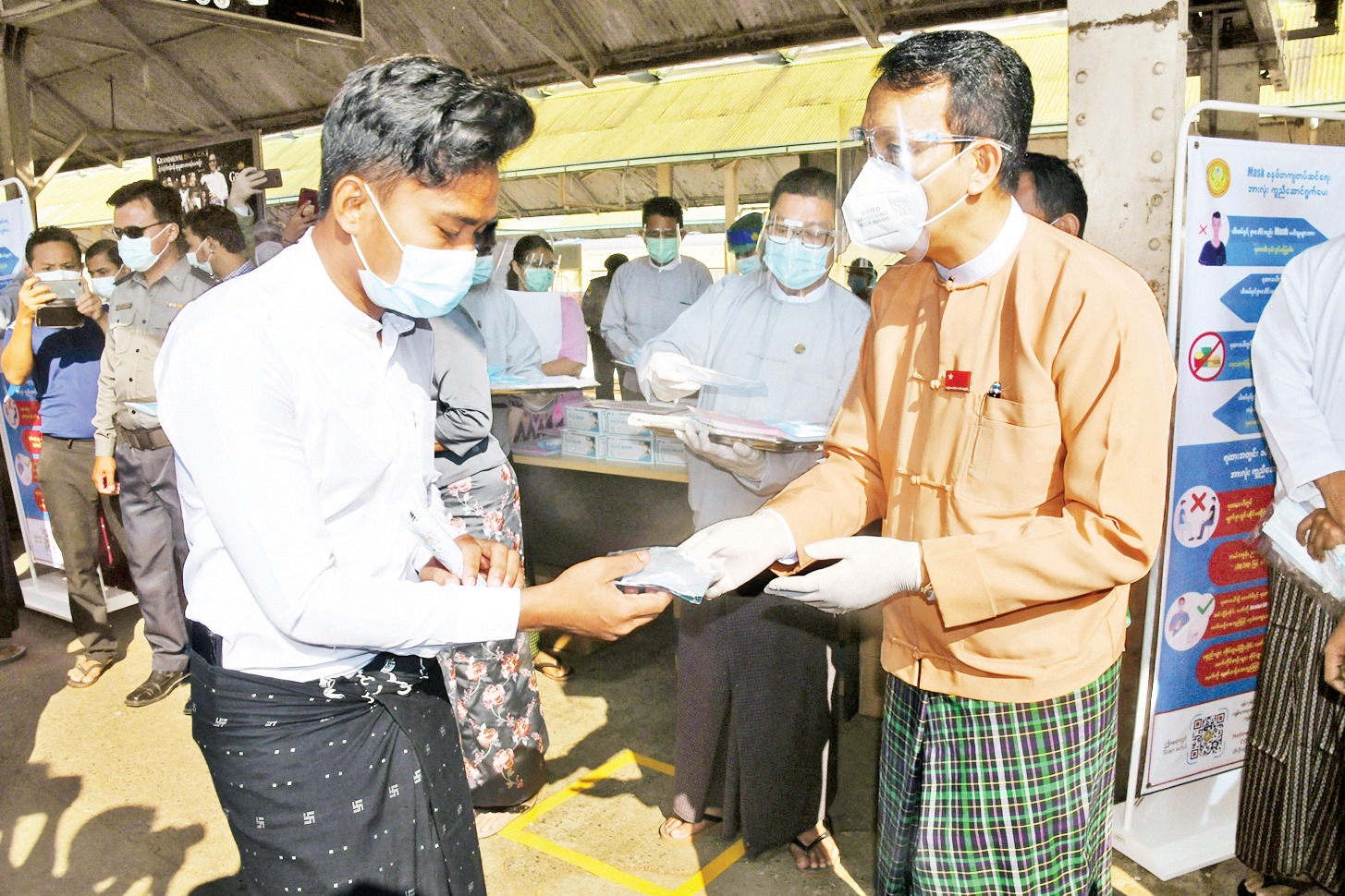 ယနေ့ပြုလုပ်သည့် ပါးစပ်နှင့် နှာခေါင်းစည်း စနစ်တကျ မဖြစ်မနေ တပ်ဆင်အသုံးပြုရေး လူထုလှုပ်ရှား မှုတွင် ရန်ကုန်တိုင်းဒေသကြီးဝန်ကြီးချုပ် ဦးဖြိုးမင်းသိန်း ဦးဆောင်ကာ မြို့ပတ်ရထားစီးနင်းလာသည့် ခရီးသွား ပြည်သူများအား နှာခေါင်းစည်းများ၊ မျက်နှာအကာများ၊ အသိပညာပေးလက်ကမ်းစာစောင်များ ဝေငှခြင်း၊ ကျန်းမာ ရေးအသိပညာပေးခြင်းများ ပြုလုပ်ကြသည်။