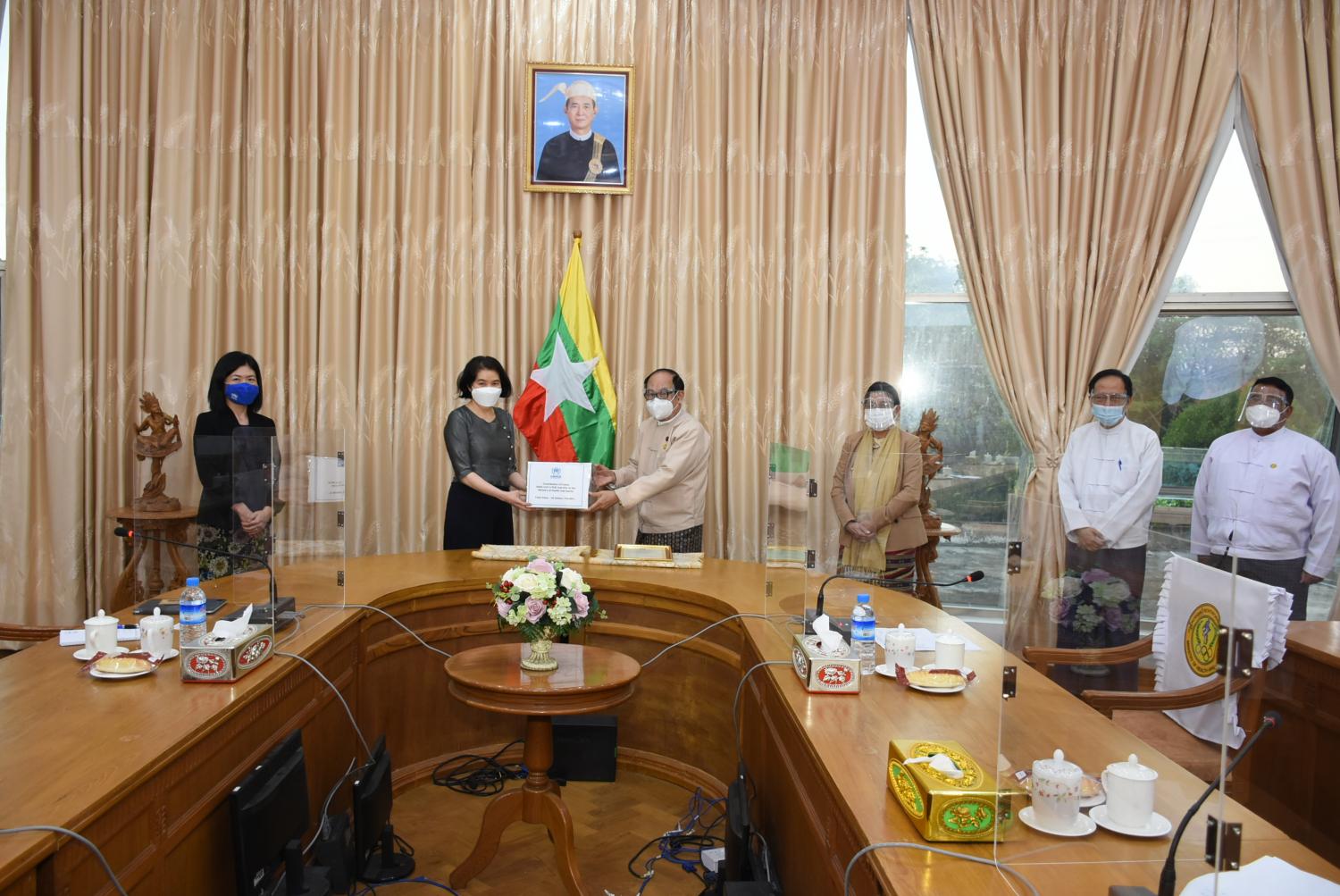ထို့နောက် Ms. Hai Kyung Jun က ကုလသမဂ္ဂဒုက္ခသည်များဆိုင်ရာ မဟာမင်းကြီးရုံး (UNHCR) မှ လှူဒါန်းသည့် Cobas SARS-CoV2- PCR Test Kit (၅၀,၀၀၀)ကို ပြည်ထောင် စု ဝန်ကြီးထံသို့ လွှဲပြောင်းပေးအပ်ခဲ့ရာ ပြည်ထောင်စုဝန်ကြီးက ကျေးဇူးတင်ဂုဏ်ပြုလွှာ ပြန်လည်ပေးအပ်သည်။
