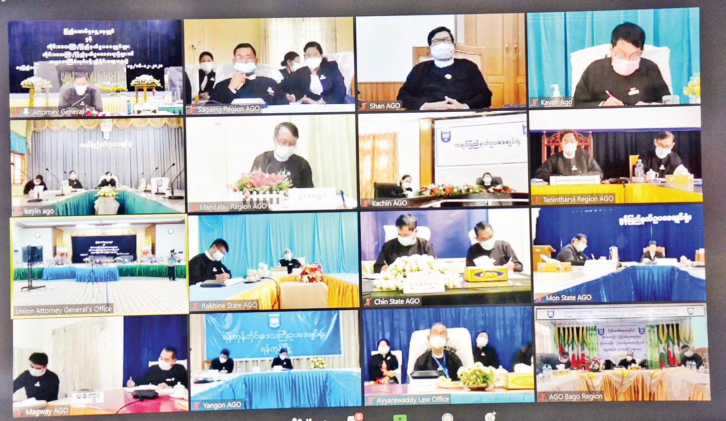 ပြည်ထောင်စုရှေ့နေချုပ်နှင့် တိုင်းဒေသကြီး/ ပြည်နယ် ဥပဒေချုပ်များ၊ တိုင်းဒေသကြီး/ ပြည်နယ် ဥပဒေအရာရှိ များ၏ အဋ္ဌမအကြိမ် လုပ်ငန်းညှိနှိုင်း ဆွေးနွေးပွဲကို ဒီဇင်ဘာ ၁၅ ရက်တွင် ပြည်ထောင်စုရှေ့နေချုပ်ရုံး အစည်း အဝေးခန်းမ၌ အွန်လိုင်းစနစ်ဖြင့် ကျင်းပသည်။