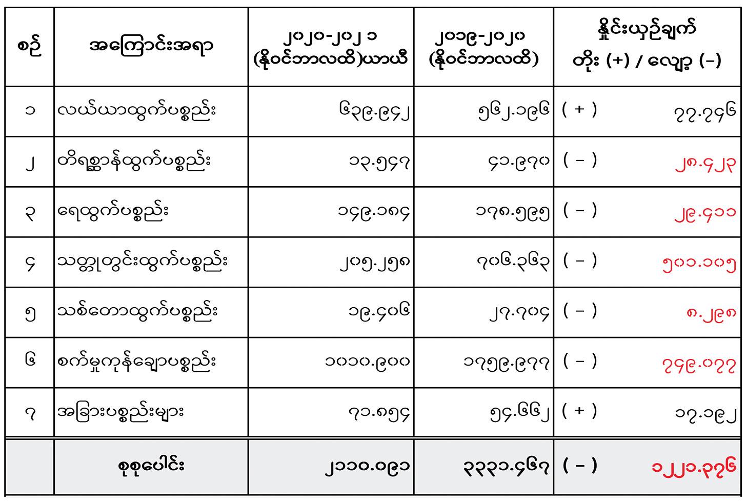 ၂။ ပြည်ပပို့ကုန်ပစ္စည်းများ အုပ်စုလိုက်တင်ပို့မှုကို ယခင်နှစ်ကာလတူနှင့် နှိုင်းယှဉ်လျှင် အောက်ပါအတိုင်း ဖြစ်ပါသည် -