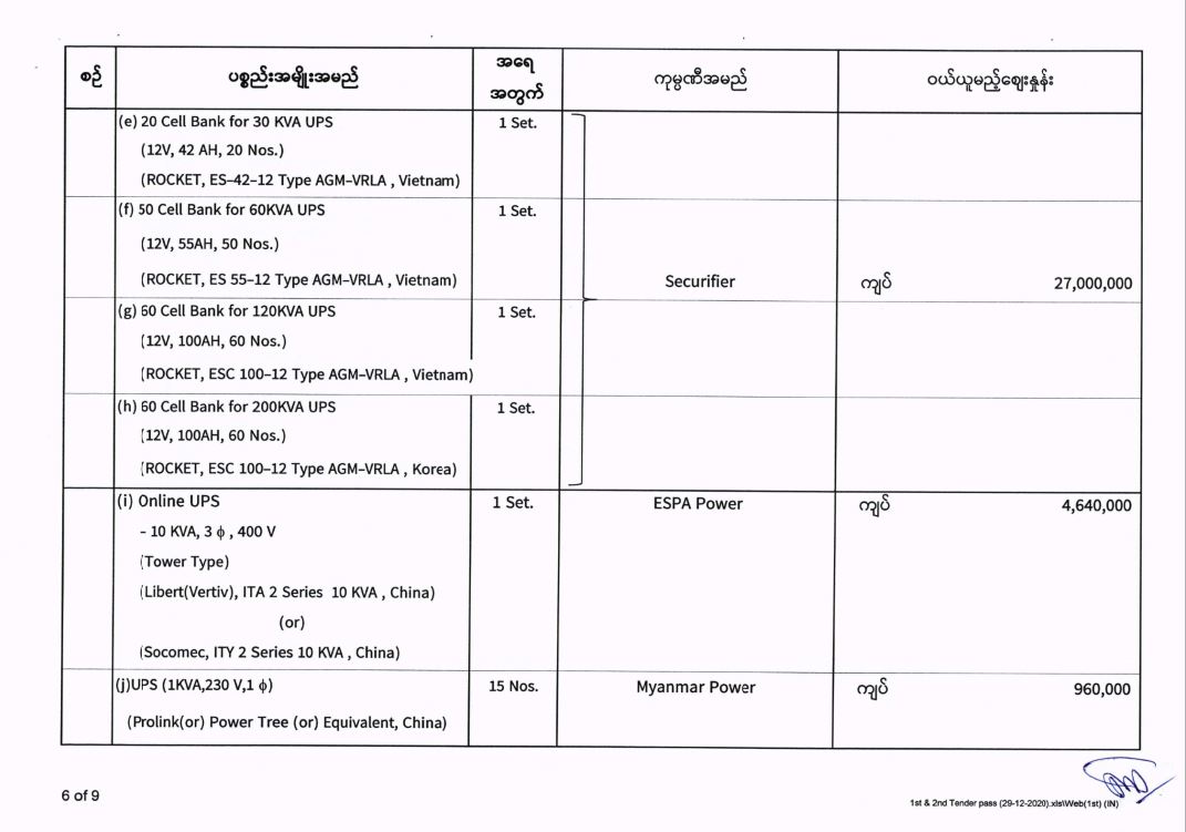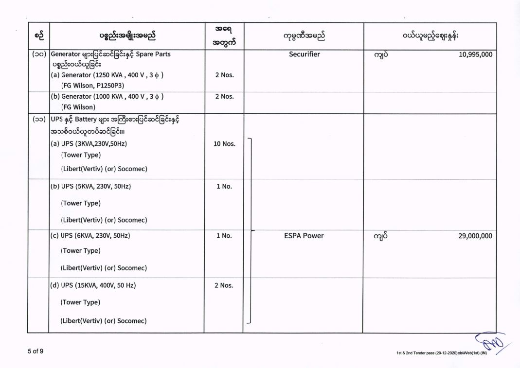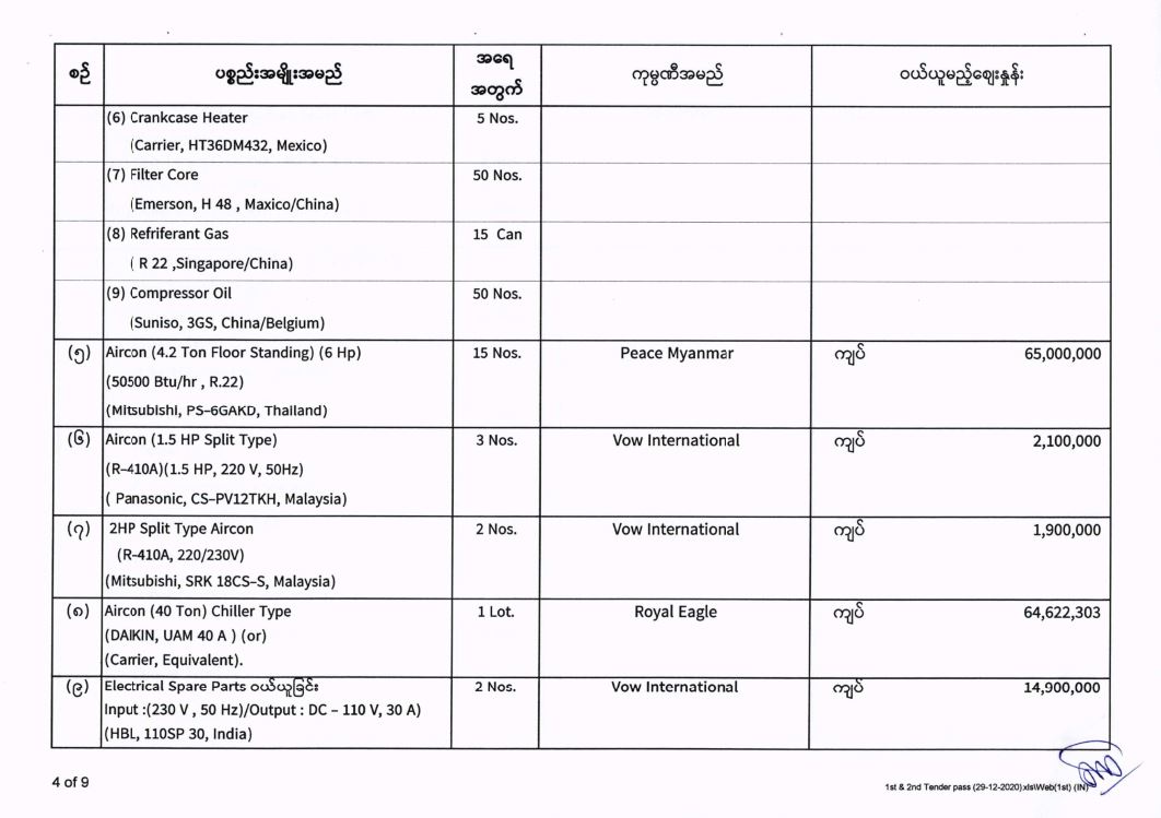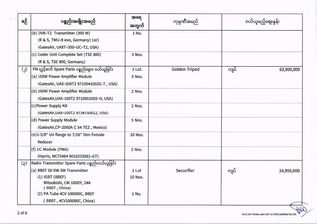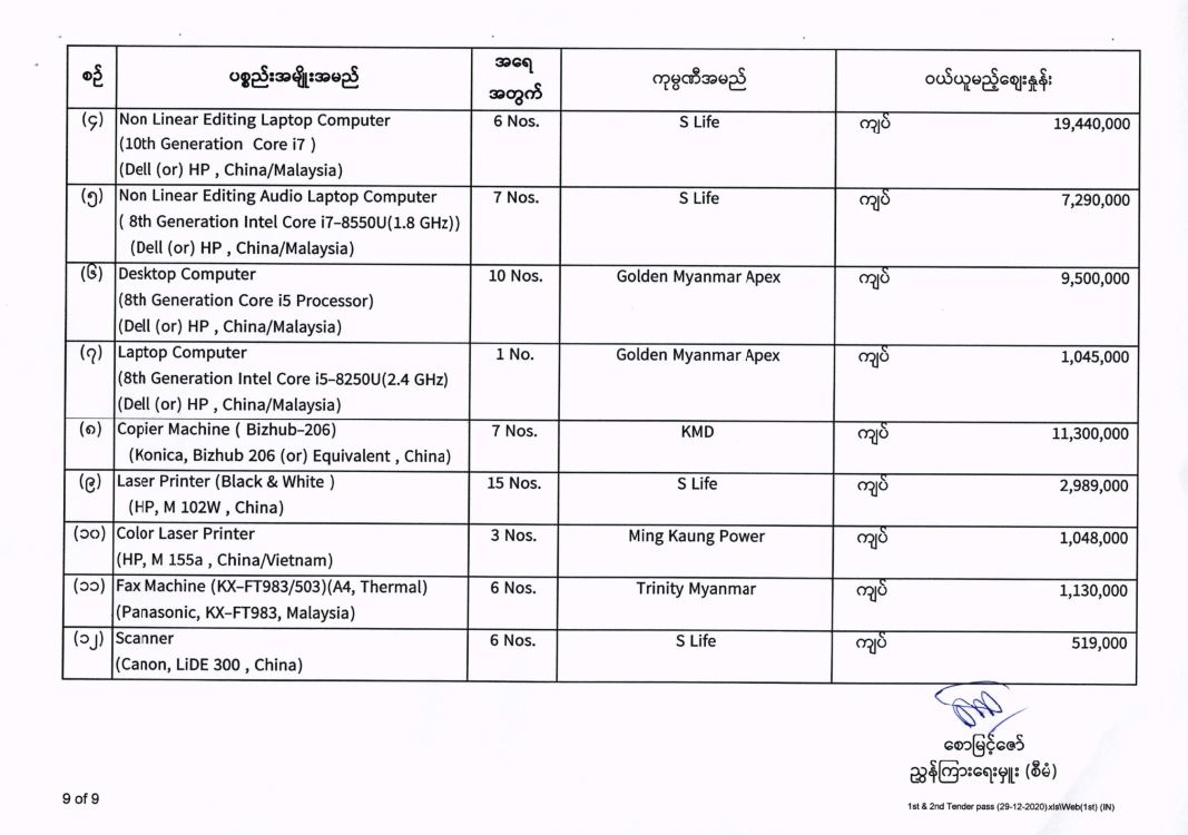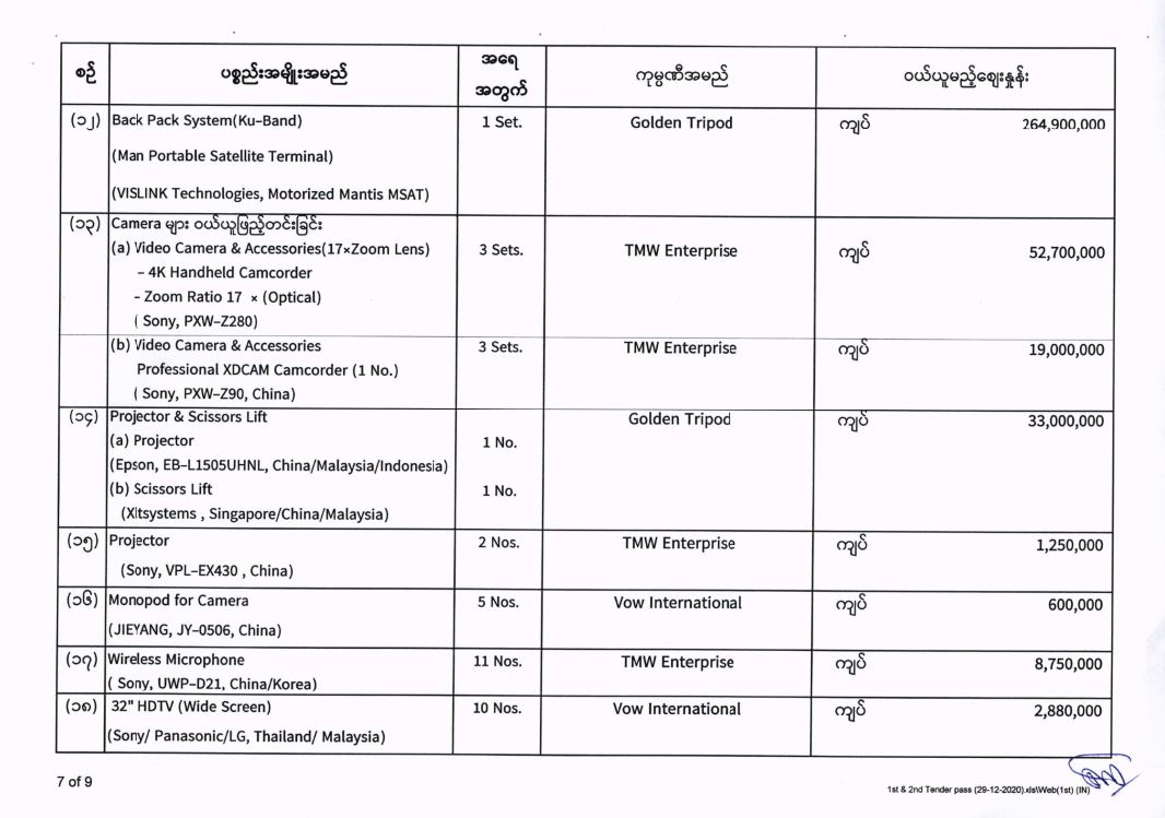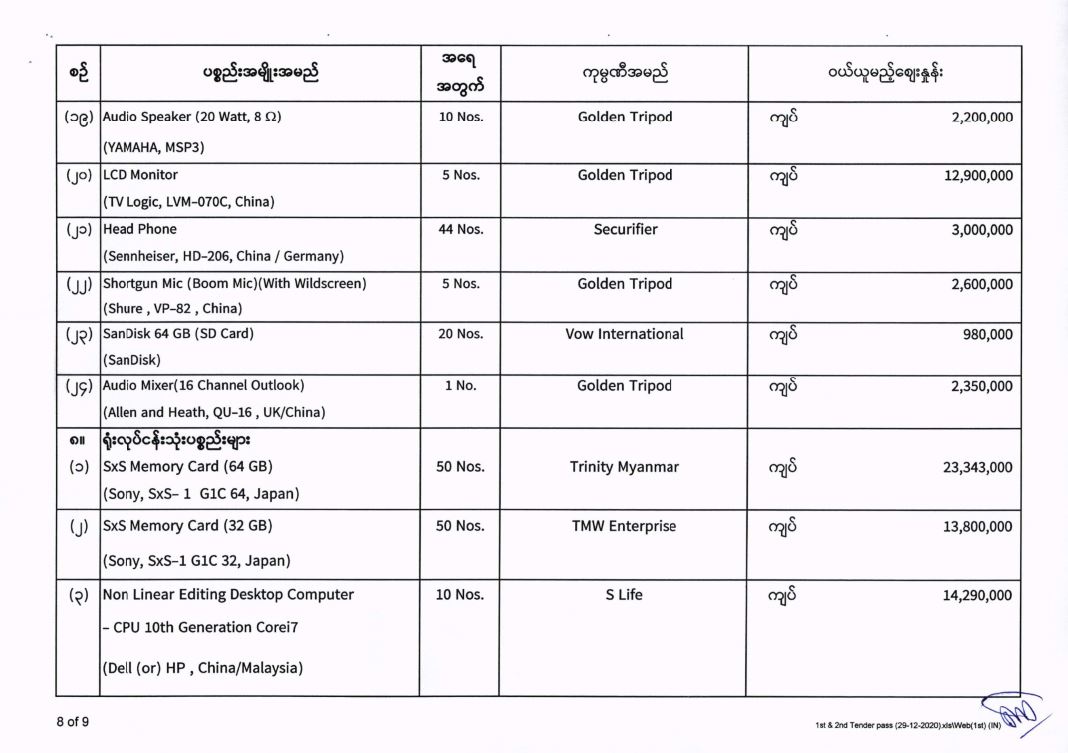 မြန်မာ့အသံနှင့်ရုပ်မြင်သံကြား၏ ၂၀၂၀-၂၀၂၁ ဘဏ္ဍာရေးနှစ် (အောက်တိုဘာလမှ စက်တင်ဘာလအထိ) (ပထမအသုတ်) ပစ္စည်းများ ဝယ်ယူရေးအတွက် (၂၉-၁၂-၂၀၂၀) ရက်နေ့တွင် ပြန်ကြားရေးဝန်ကြီးဌာန၊ ပြည်တွင်း/ပြည်ပ ပစ္စည်းများ ဝယ်ယူရေးနှင့် ထုခွဲရောင်းချရေး ကော်မတီမှ ဈေးနှုန်းစိစစ်ခဲ့ရာ ဖော်ပြပါကုမ္ပဏီများမှ ယှဉ်တွဲပါ ဈေးနှုန်းများဖြင့် တင်ဒါအောင်မြင်ကြောင်း ကြေညာအပ်ပါသည်