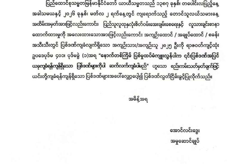 ပြည်ထောင်စုသမ္မတမြန်မာနိုင်ငံတော် ယာယီသမ္မတသည် ယနေ့တွင်ကျရောက်သည့် (၆၄) နှစ်မြောက် တောင်သူလယ်သမားနေ့အထိမ်းအမှတ်နေ့ကို ဂုဏ်ပြုသောအားဖြင့် ပြည်သူလူထုနှလုံးစိတ်ဝမ်းအေးချမ်းစေရန်နှင့် လူသားချင်းစာနာထောက်ထားမှုကို အလေးထားသောအားဖြင့် နိုင်ငံတော်၏မေတ္တာနှင့် စေတနာကိုနားလည်စေရန်ရှေးရှု၍ ၂ဝ၂၆ ခုနှစ်၊ မတ်လ ၂ ရက်နေ့မတိုင်မီ လူသတ်မှု၊ မုဒိမ်းမှု၊ ပေါက်ကွဲစေတတ်သော ဝတ္ထုပစ္စည်းများအက်ဥပဒေအရ ပြစ်မှုများ၊ မတရားအသင်းများအက်ဥပဒေအရ ပြစ်မှုများ၊ ၁၈၇၈ ခုနှစ် လက်နက်များအက်ဥပဒေပုဒ်မ ၁၉(စ)အရ ပြစ်မှုများ၊ ၁၉၄၉ ခုနှစ် လက်နက်(အရေးပေါ် ပြစ်ဒဏ်စီရင်မှု) (ယာယီ) အက်ဥပဒေအရပြစ်မှုများ၊ ၁၉၅၁ ခုနှစ် လက်နက်(ယာယီပြင်ဆင်ချက်) အက်ဥပဒေအရပြစ်မှုများ၊ ၁၉၂၄ ခုနှစ် ရှမ်းပြည်နယ်လက်နက်အမိန့်အရ ပြစ်မှုများ၊ ၂ဝ၂၃ ခုနှစ်၊ လက်နက်ဥပဒေအရ ပြစ်မှုများ၊ မူးယစ်ဆေးဝါးနှင့် စိတ်ကိုပြောင်းလဲစေတတ်သော ဆေးဝါးများဆိုင်ရာဥပဒေအရပြစ်မှုများ၊ သဘာဝဘေးအန္တရာယ်ဆိုင်ရာစီမံခန့်ခွဲမှုဥပဒေအရပြစ်မှုများ၊ အကြမ်းဖက်မှုတိုက်ဖျက်ရေး ဥပဒေအရပြစ်မှုများနှင့် အဂတိလိုက်စားမှုတိုက်ဖျက်ရေးဥပဒေအရ ပြစ်မှုများမှအပ တည်ဆဲဥပဒေတစ်ရပ်ရပ်အရ ပြစ်မှုတစ်ခုခုနှင့်စပ်လျဉ်း၍ ပြစ်ဒဏ်ချမှတ်ခြင်းခံရပြီး အကျဉ်းထောင်/ အချုပ်ထောင်/ စခန်းအသီးသီးတွင် ပြစ်ဒဏ်ကျခံလျက်ရှိသော အကျဉ်းသား/အကျဉ်းသူများကို ရာဇဝတ်ကျင့်ထုံးဥပဒေပုဒ်မ ၄၀၁၊ ပုဒ်မခွဲ(၁) အရ ယင်းတို့ကျခံရန် ကျန်ရှိသောပြစ်ဒဏ်၏ ခြောက်ပုံတစ်ပုံကို လွတ်ငြိမ်းသက်သာခွင့်အားလည်းကောင်း၊ နိုင်ငံတစ်ဝန်းရှိ အကျဉ်းထောင်/ အချုပ်ထောင်/ စခန်းအသီးသီးတွင် ပြစ်ဒဏ်ကျခံလျက်ရှိသော အကျဉ်းသား/ အကျဉ်းသူ ၂၈၂၅ ဦးကို ရာဇဝတ်ကျင့်ထုံးဥပဒေပုဒ်မ ၄၀၁၊ ပုဒ်မခွဲ(၁)အရ “နောက်တစ်ကြိမ် ပြစ်မှုထပ်မံကျူးလွန်ပါက ၎င်းပြစ်ဒဏ်အပြင် ယခုကျခံရန် ကျန်ရှိသော ပြစ်ဒဏ်များကိုပါ ဆက်လက်ကျခံပါမည်" ဟူသော စည်းကမ်းသတ်မှတ်ချက်ဖြင့် ယင်းတို့ကျခံရန်ကျန်ရှိသော ပြစ်ဒဏ်များအပေါ် လျှော့ပေါ့၍ ပြစ်ဒဏ်လွတ်ငြိမ်းခွင့်အားလည်းကောင်း ခွင့်ပြုခဲ့သည်။