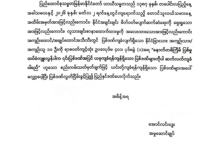 အကြမ်းဖက်မှုတိုက်ဖျက်ရေးဥပဒေပုဒ်မ ၅ဝ(ည)၊ ၅၂(က) ဖြင့် ကြားနာစစ်ဆေးဆဲအမှုများကိုပိတ်သိမ်းခြင်း