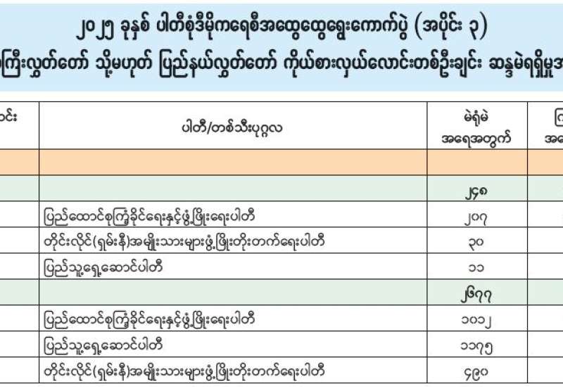 အမျိုးသားလွှတ်တော် (အချိုးကျကိုယ်စားပြုစနစ်)၊ ဧရာဝတီတိုင်းဒေသကြီးမဲဆန္ဒနယ်အမှတ် (၂) နိုင်ငံရေးပါတီများ၏ ကိုယ်စားလှယ်လောင်းရရှိမှုအခြေအနေ
