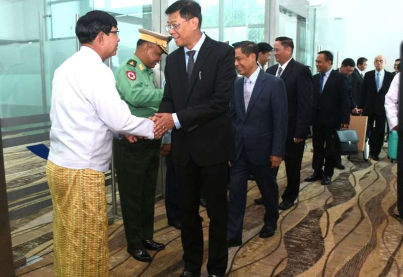 နိုင်ငံတော်စီမံအုပ်ချုပ်ရေးကောင်စီဥက္ကဋ္ဌ တပ်မတော်ကာကွယ်ရေးဦးစီးချုပ် ဗိုလ်ချုပ်မှူးကြီးမင်းအောင်လှိုင်အား တစ်နိုင်ငံလုံးပစ်ခတ်တိုက်ခိုက်မှုရပ်စဲရေး သဘောတူစာချုပ်(NCA) (၈)နှစ်မြောက်နှစ်ပတ်လည်နေ့အခမ်းအနားသို့ တက်ရောက်ခဲ့သော သျှမ်းပြည်ပြန်လည်ထူထောင်ရေးကောင်စီ(RCSS)ဥက္ကဋ္ဌ ဗိုလ်ချုပ်ကြီးယွက်စစ် ဦးဆောင်သည့်အဖွဲ့က ယနေ့နံနက်ပိုင်းတွင် နေပြည်တော်ရှိ ဘုရင့်နောင်ရိပ်သာ၊ ဧည့်ခန်းမဆောင်၌ လာရောက်ဂါရဝပြုတွေ့ဆုံသည်။