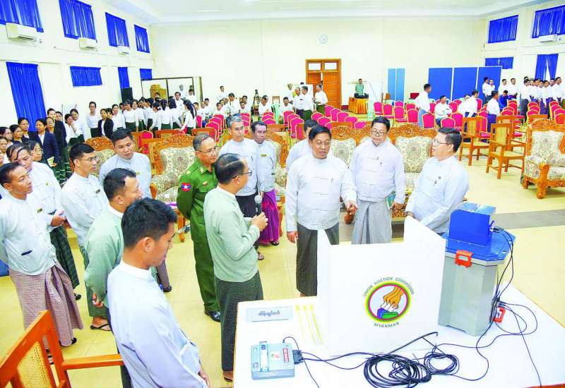 ပြည်ထောင်စုရွေးကောက်ပွဲကော်မရှင်က မြန်မာအီလက်ထရောနစ်မဲပေးစက်နှင့် စပ်လျဉ်း၍ ရှင်းလင်းပြသခြင်းနှင့် လက်တွေ့သရုပ်ပြ စမ်းသပ်မဲပေးခြင်းကို ယနေ့နံနက်ပိုင်းတွင် ကာကွယ်ရေးဝန်ကြီးဌာန အစည်းအဝေးခန်းမ၌ကျင်းပရာ နိုင်ငံတော်စီမံအုပ်ချုပ်ရေးကောင်စီအဖွဲ့ဝင်၊ ဒုတိယဝန်ကြီးချုပ်နှင့် ကာကွယ်ရေးဝန်ကြီးဌာန ပြည်ထောင်စုဝန်ကြီး ဗိုလ်ချုပ်ကြီးတင်အောင်စန်း၊ ဒုတိယဝန်ကြီး ဗိုလ်ချုပ်အောင်လင်းထွန်းနှင့် ကာကွယ်ရေးဝန်ကြီးဌာနမှ အရာထမ်း၊ အမှုထမ်းများ တက်ရောက်ကြသည်။