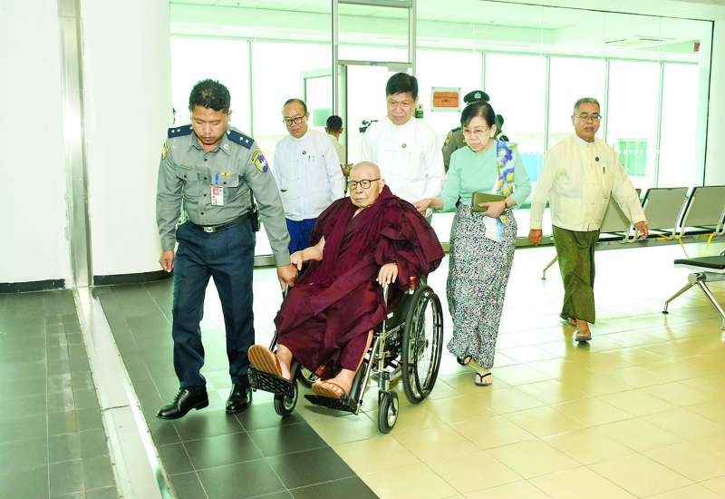 နိုင်ငံတော်ဩဝါဒါစရိယ အမရပူရမြို့နယ် မဟာဂန္ဓာရုံကျောင်းတိုက်ကြီး၏ မဟာနာယကချုပ်၊ အဘိဓဇမဟာရဋ္ဌဂုရု ဘဒ္ဒန္တဣန္ဒောဘာသာဘိဝံသသည် သီတဂူ ကမ္ဘာ့ဗုဒ္ဓတက္ကသိုလ်များ၏ အဓိပတိ အဘိဓဇ မဟာရဋ္ဌဂုရု အဘိဓဇ အဂ္ဂမဟာသဒ္ဓမ္မဇောတိက ဒေါက်တာဘဒ္ဒန္တဉာဏိဿရလိုက်ပါ၍ ထိုင်းနိုင်ငံ ဘန်ကောက်မြို့တွင် ကျန်းမာရေးအရ ဆေးကုသမှုခံယူခဲ့ပြီး ယနေ့မွန်းလွဲပိုင်းတွင် လေကြောင်းခရီးဖြင့် မန္တလေးမြို့သို့ ပြန်လည်ကြွရောက်လာရာ မန္တလေးတိုင်းဒေသကြီးဝန်ကြီးချုပ် ဦးမျိုးအောင်နှင့်ဇနီး၊ တိုင်းဒေသကြီးအစိုးရအဖွဲ့ဝင်ဝန်ကြီးများနှင့် တာဝန်ရှိသူများက တံတားဦးအပြည်ပြည်ဆိုင်ရာ လေဆိပ်၌ ခရီးဦးကြိုဆိုဖူးမြော်ကြသည်။