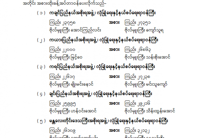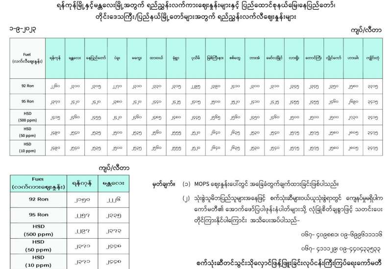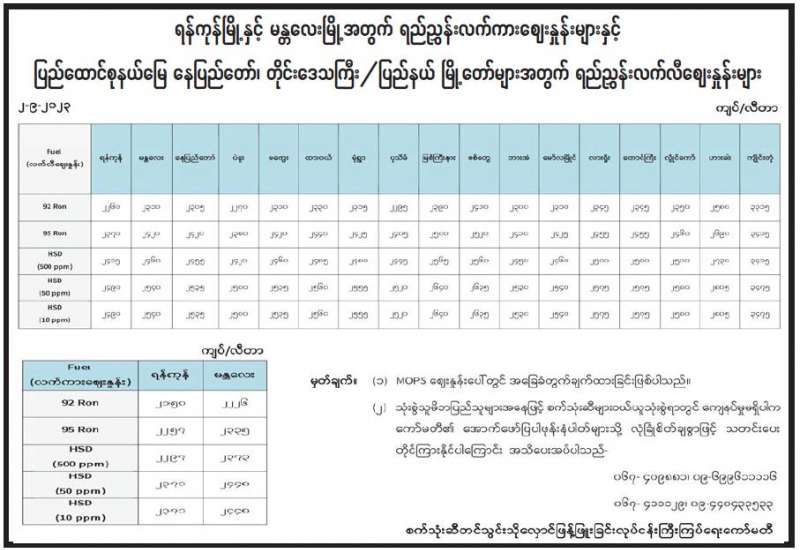 ရန်ကုန်မြို့နှင့် မန္တလေးမြို့အတွက် ရည်ညွှန်းလက်ကားဈေးနှုန်းများနှင့် ပြည်ထောင်စုနယ်မြေ နေပြည်တော်၊ တိုင်းဒေသကြီး/ ပြည်နယ် မြို့တော်များအတွက် ရည်ညွှန်းလက်လီဈေးနှုန်းများ