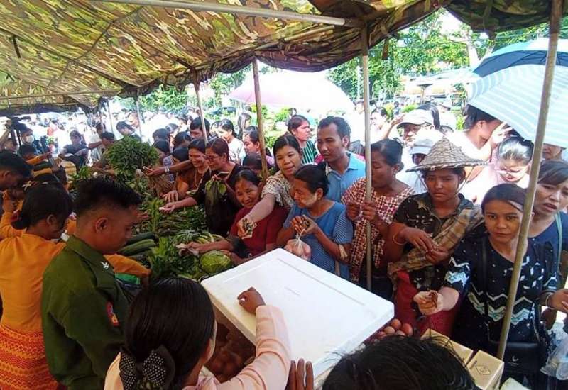 ဆိုင်ကလုန်းမုန်တိုင်း(မိုခါ)တိုက်ခတ်မှုကြောင့် မုန်တိုင်းဒဏ်သင့် ဒေသခံပြည်သူများနှင့် ဌာနဆိုင်ရာဝန်ထမ်းများ၏ စားသောက်ရေးအဆင်ပြေစေရန်နှင့် မိမိတို့အလိုရှိရာ စားသောက်ကုန်ပစ္စည်းများကို ဈေးနှုန်းသက်သာစွာဖြင့် ဝယ်ယူစားသောက်နိုင်ရေးအတွက် အနောက်ပိုင်းတိုင်းစစ်ဌာနချုပ်၊ နယ်မြေခံတပ်မတော်သားများနှင့် တာဝန်ရှိသူများက နေ့စဉ်ရောင်းချပေးလျက်ရှိသည်။