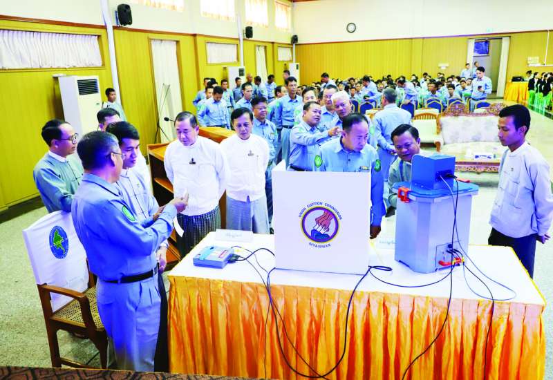 ပြည်ထောင်စုရွေးကောက်ပွဲကော်မရှင်က မြန်မာအီလက်ထရောနစ်မဲပေးစက်နှင့် စပ်လျဉ်းပြီး ရှင်းလင်းပြသခြင်းနှင့် လက်တွေ့သရုပ်ပြစမ်းသပ် မဲပေးခြင်းကို ယနေ့နံနက်ပိုင်းက နယ်စပ်ရေးရာဝန်ကြီးဌာန အစည်းအဝေးခန်းမနှင့် မွန်းလွဲပိုင်းတွင် စွမ်းအင်ဝန်ကြီးဌာန အစည်းအဝေးခန်းမတို့၌ ကျင်းပသည်။
