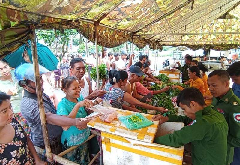 ဆိုင်ကလုန်းမုန်တိုင်း(မိုခါ)တိုက်ခတ်မှုကြောင့် မုန်တိုင်းဒဏ်သင့် ဒေသခံပြည်သူများနှင့် ဌာနဆိုင်ရာဝန်ထမ်းများ၏ စားသောက်ရေးအဆင်ပြေစေရန်နှင့် မိမိတို့အလိုရှိရာ စားသောက်ကုန်ပစ္စည်းများကို ဈေးနှုန်းသက်သာစွာဖြင့် ဝယ်ယူစားသောက်နိုင်ရေးအတွက် အနောက်ပိုင်းတိုင်းစစ်ဌာနချုပ်၊ နယ်မြေခံတပ်မတော်သားများနှင့် တာဝန်ရှိသူများက နေ့စဉ်ရောင်းချပေးလျက်ရှိသည်။