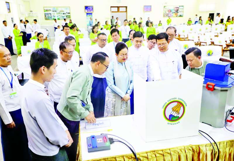 ပြည်ထောင်စုရွေးကောက်ပွဲကော်မရှင်က မြန်မာအီလက်ထရွန်နစ်မဲပေးစက်နှင့် စပ်လျဉ်းပြီး ရှင်းလင်းပြသခြင်းနှင့် လက်တွေ့သရုပ်ပြစမ်းသပ်မဲပေးခြင်းကို ယနေ့နံနက်ပိုင်းတွင် လူဝင်မှုကြီးကြပ်ရေးနှင့်ပြည်သူ့အင်အားဝန်ကြီးဌာန အစည်းအဝေးခန်းမနှင့် မွန်းလွဲပိုင်းတွင် ဟိုတယ်နှင့်ခရီးသွားလာရေးဝန်ကြီးဌာန အစည်းအဝေးခန်းမတို့၌ ကျင်းပသည်။