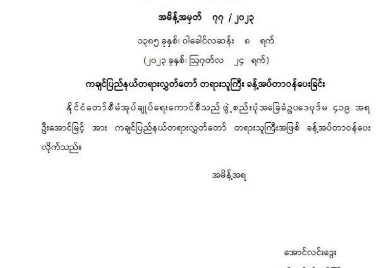 ကချင်ပြည်နယ်တရားလွှတ်တော် တရားသူကြီး ခန့်အပ်တာဝန်ပေးခြင်း