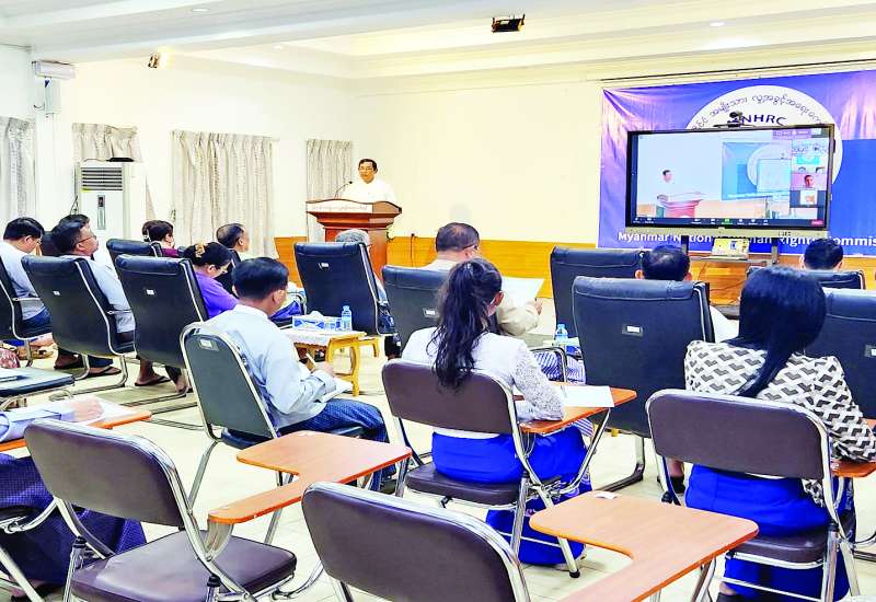 မြန်မာနိုင်ငံ အမျိုးသားလူ့အခွင့်အရေးကော်မရှင်ရုံး အရာထမ်း/အမှုထမ်းများအတွက် ၂၀၂၃ ခုနှစ် အခြေခံရုံးလုပ်ငန်းသင်တန်း (ပထမအကြိမ်) ဖွင့်ပွဲအခမ်းအနားကို ယနေ့မွန်းလွဲ ၁ နာရီတွင် ကော်မရှင်ရုံး Conference Room ၌ ကိုဗစ်-၁၉ ရောဂါကာလအတွင်း လိုက်နာရမည့် စည်းမျဉ်းစည်းကမ်းများနှင့်အညီ ကျင်းပသည်။