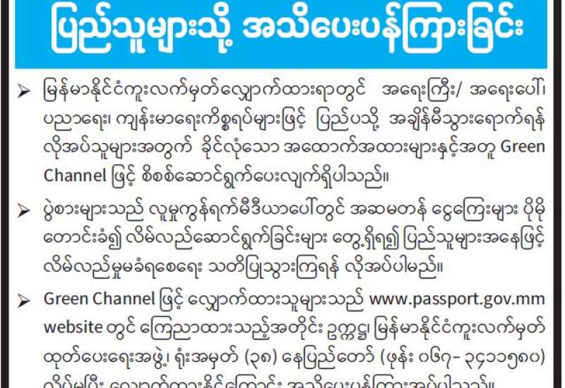 တရုတ်နိုင်ငံ ယူနန်ပြည်နယ် ကူမင်းမြို့၌ ဩဂုတ် ၁၆ ရက်မှ ၁၉ ရက်အထိ ကျင်းပမည့် စတုတ္ထ အကြိမ်မြောက် မဲခေါင် - လန်ချန်းရုပ်သံ သီတင်းပတ် စားပွဲဝိုင်းဆွေးနွေးပွဲ (4th Lancang–Mekong Audiovisual Week Roundtable Conference)သို့ တက်ရောက်ရန် ပြန်ကြားရေးဝန်ကြီးဌာန မြန်မာ့အသံနှင့်ရုပ်မြင်သံကြား ညွှန်ကြားရေးမှူးချုပ် ဦးရဲနိုင်နှင့်အဖွဲ့သည် ယနေ့မွန်းလွဲပိုင်းတွင် ရန်ကုန်မြို့မှ တရုတ်နိုင်ငံ ကူမင်းမြို့သို့ လေကြောင်းခရီးဖြင့် ထွက်ခွာသွားသည်။