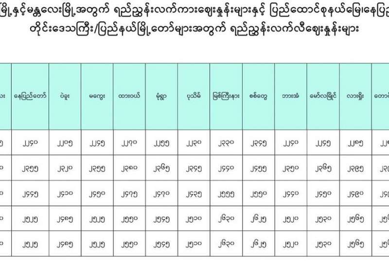 ရန်ကုန်မြို့နှင့် မန္တလေးမြို့အတွက် ရည်ညွှန်းလက်ကားဈေးနှုန်းများနှင့် ပြည်ထောင်စုနယ်မြေ နေပြည်တော်၊ တိုင်းဒေသကြီး/ပြည်နယ် မြို့တော်များအတွက် ရည်ညွှန်းလက်လီဈေးနှုန်းများ