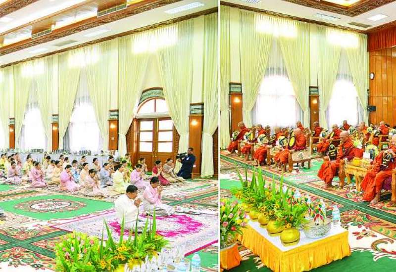 ၂၀၂၃ ခုနှစ် ကာကွယ်ရေးဦးစီးချုပ်ရုံး(ကြည်း၊ ရေ၊ လေ) မိသားစုများ ဝါဆိုသင်္ကန်းဆက်ကပ်လှူဒါန်းပွဲမဟာမင်္ဂလာအခမ်းအနားကို ယနေ့နံနက်ပိုင်းတွင် ကာကွယ်ရေးဦးစီးချုပ်ရုံး(ကြည်း) အနော်ရထာခန်းမ၌ ကျင်းပပြုလုပ်ရာ နိုင်ငံတော်စီမံအုပ်ချုပ်ရေးကောင်စီဥက္ကဋ္ဌ တပ်မတော်ကာကွယ်ရေးဦးစီးချုပ် ဗိုလ်ချုပ်မှူးကြီး မင်းအောင်လှိုင်နှင့်ဇနီး ဒေါ်ကြူကြူလှတို့ တက်ရောက်ကြည်ညို၍ ဝါဆိုသင်္ကန်း၊ လှူဖွယ်ပစ္စည်းများနှင့် နေ့ဆွမ်းတို့ကို ဆက်ကပ်လှူဒါန်းသည်။