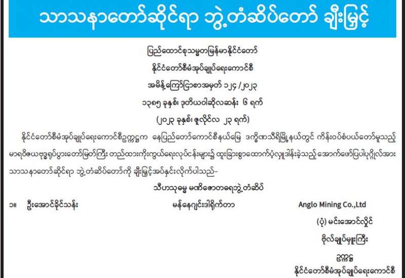 ၁။ မြန်မာနိုင်ငံတွင် ၁၄-၅-၂၀၂၃ ရက်နေ့တွင် ဖြစ်ပွားခဲ့သည့် အလွန့်အလွန်အားကောင်းသော ဆိုင်ကလုန်းမုန်တိုင်း မိုခါကြောင့် ဘေးသင့်ပြည်သူများအတွက် ပါဝင်လှူဒါန်းလိုသော စေတနာရှင်ပြည်သူများအနေဖြင့် မြန်မာကျပ်ငွေစာရင်းအမှတ် OA -011834 နှင့် နိုင်ငံခြား ငွေစာရင်းအမှတ် 1DA- 0300086 သို့ ထည့်ဝင်လှူဒါန်းနိုင်ကြောင်း ကြေညာခဲ့ပါသည်။