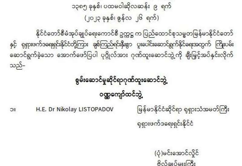 မြန်မာနိုင်ငံဆိုင်ရာ ရုရှားဖက်ဒရေးရှင်းနိုင်ငံသံအမတ်ကြီး ဒေါက်တာနီကိုလိုင်း လစ်စတိုပါဒေါ့ဗ်သည် မြန်မာနိုင်ငံရှိ ရုရှားဖက်ဒရေးရှင်းနိုင်ငံသံရုံးတွင် ၁၉၈၃ ခုနှစ်မှ ၁၉၈၆ ခုနှစ်အထိနှင့် ၁၉၉၀ ပြည့်နှစ်မှ ၁၉၉၄ ခုနှစ်အထိ တာဝန်ထမ်းခဲ့ပြီး မြန်မာနိုင်ငံဆိုင်ရာ ရုရှားဖက်ဒရေးရှင်းနိုင်ငံ သံအမတ်ကြီးအဖြစ် ၎င်း၏သံအမတ်ခန့်အပ်လွှာကို ၂၀၁၆ ခုနှစ်၊ အောက်တိုဘာလတွင် စတင်ပေးအပ်တာဝန်ထမ်းဆောင်ခဲ့ပါသည်။