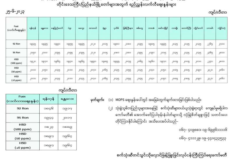 ရန်ကုန်မြို့နှင့် မန္တလေးမြို့အတွက် ရည်ညွှန်းလက်ကားဈေးနှုန်းများနှင့် ပြည်ထောင်စုနယ်မြေ နေပြည်တော်၊ တိုင်းဒေသကြီး/ပြည်နယ် မြို့တော်များအတွက် ရည်ညွှန်းလက်လီဈေးနှုန်းများ