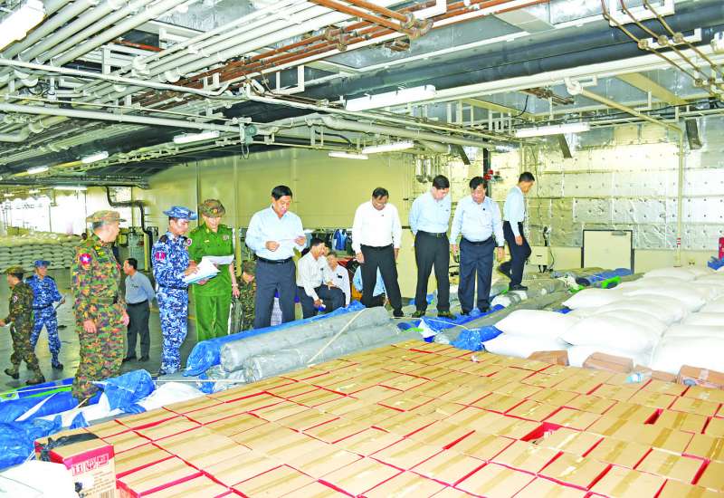 ရခိုင်ပြည်နယ် စစ်တွေမြို့၌ရောက်ရှိနေသော နိုင်ငံတော်စီမံအုပ်ချုပ်ရေးကောင်စီအဖွဲ့ဝင် ဒုတိယဝန်ကြီးချုပ်နှင့် ပို့ဆောင်ရေးနှင့်ဆက်သွယ်ရေးဝန်ကြီးဌာန ပြည်ထောင်စုဝန်ကြီး ဗိုလ်ချုပ်ကြီး တင်အောင်စန်း၊ ပြည်ထောင်စုဝန်ကြီးများ၊ တပ်မတော်အရာရှိကြီးများ၊ ပြည်နယ်ဝန်ကြီးချုပ်၊ တိုင်းမှူး၊ ဒုတိယဝန်ကြီးများနှင့် တာဝန်ရှိသူများသည် ယနေ့နံနက်ပိုင်းက စစ်တွေမြို့ဘက်စုံသုံးဆိပ်ကမ်း၌ ရန်ကုန်မြို့မှ ထောက်ပံ့ရေးပစ္စည်းများနှင့် ပြန်လည်ထူထောင်ရေးပစ္စည်းများ တင်ဆောင်လာသည့် စစ်ရေယာဉ်မုတ္တမကို သွားရောက်ကြည့်ရှုပြီး ကယ်ဆယ်ရေးပစ္စည်းများအား ပို့ဆောင်ရမည့်ဒေသများသို့ အမြန်ဆုံးပို့ဆောင်နိုင်ရေး စီစဉ်ဆောင်ရွက်သည်။