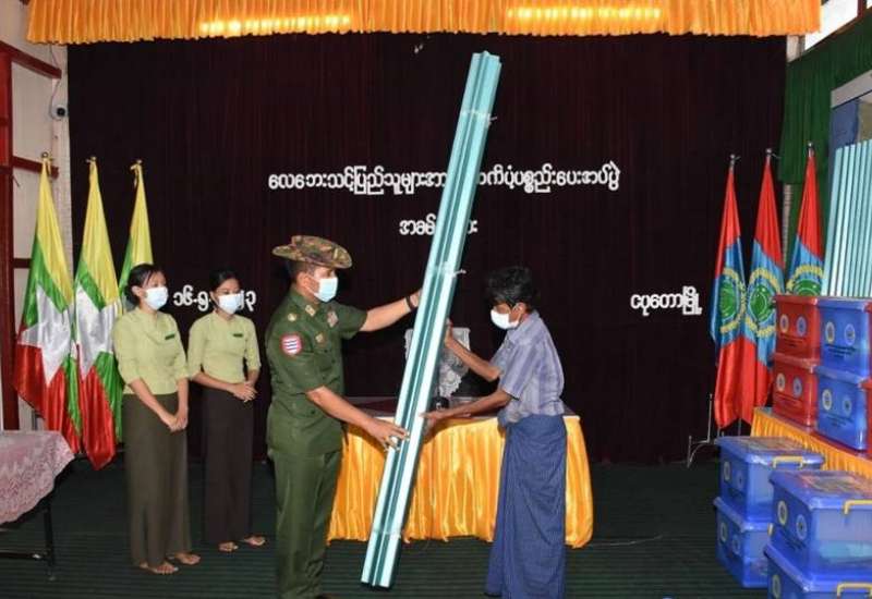 ဧရာဝတီတိုင်းဒေသကြီးအတွင်း လေပြင်းတိုက်ခတ်မှုကြောင့် နေအိမ်များ ပြိုကျပျက်စီးခဲ့သည့် ငပုတောမြို့၊ ငရုတ်ကောင်းမြို့နှင့် ဟိုင်းကြီးကျွန်းမြို့များအတွင်းရှိ မုန်တိုင်းသင့်ပြည်သူများကို အိမ်မိုးသွပ်များ၊ သွပ်သံများ၊ ထောက်ပံ့ပစ္စည်းများနှင့် ထောက်ပံ့ငွေများ ပေးအပ်ခြင်းကို ယနေ့နေ့လယ်ပိုင်းတွင် ငပုတောမြို့နယ်၊ အထွေထွေအုပ်ချုပ်ရေးဦးစီးဌာနရုံး၌ ပြုလုပ်ရာ အနောက်တောင်တိုင်း စစ်ဌာနချုပ်တိုင်းမှူး ဗိုလ်မှူးချုပ်ကြည်ခိုင်နှင့် တာဝန်ရှိသူများ၊ ခရိုင်/မြို့နယ်စီမံ အုပ်ချုပ်ရေးအဖွဲ့ဝင်များ၊ ခရိုင်သဘာဝဘေးအန္တရာယ်စီမံခန့်ခွဲမှု ကော်မတီအတွင်းရေးမှူး၊ မြို့နယ်ဆင့် ဌာနဆိုင်ရာများ၊ မြို့မိမြို့ဖများ၊ လူမှုရေးအသင်းအဖွဲ့များနှင့် မုန်တိုင်းသင့်ပြည်သူများ တက်ရောက်ကြသည်။