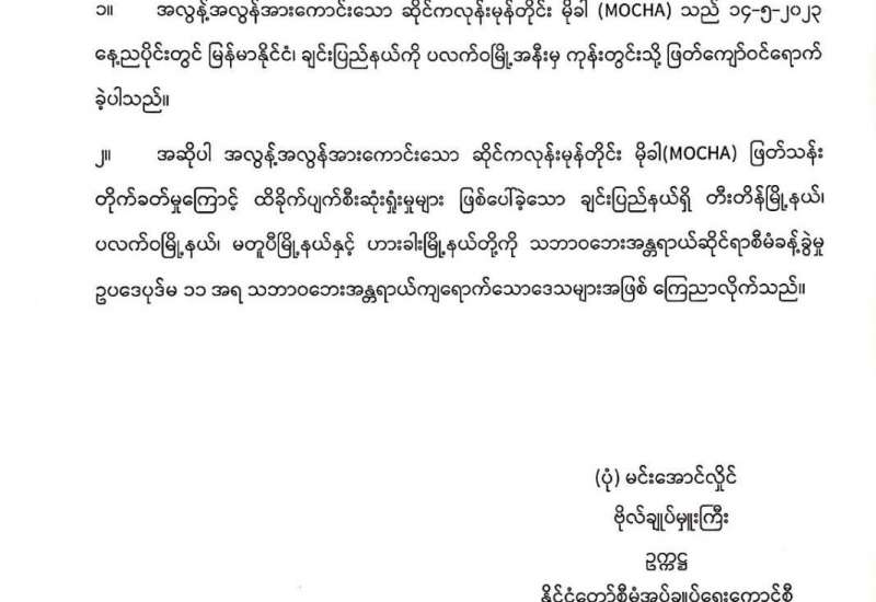 အလွန့်အလွန်အားကောင်းသော ဆိုင်ကလုန်းမုန်တိုင်း (Severe Cyclonic Storm) "ဖိုခါ" (MOCHA) သည် မေ ၁၄ ရက်တွင် ရခိုင်ကမ်းရိုး တန်းဒေသများသို့ စစ်တွေမြို့အနီးမှ ဖြတ်ကျော် ဝင်ရောက်ခဲ့ပြီး ယင်းဒေသအတွင်း ထိခိုက်ပျက်စီးဆုံးရှုံးမှုများ ဖြစ်ပေါ်ခဲ့ကာ ရခိုင်ပြည်နယ်အတွင်းရှိ မြို့နယ် ၁၇ မြို့နယ်ကို သဘာဝဘေးအန္တရာယ်ကျရောက်သော ဒေသများအဖြစ် ကြေညာခဲ့ပါသည်။