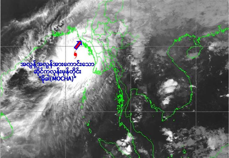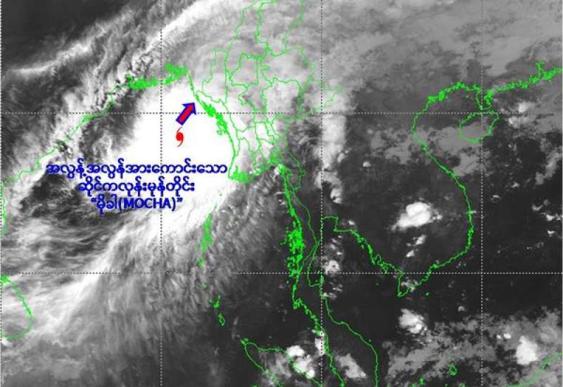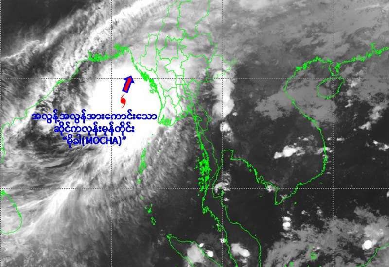 (၁) ယနေ့မြန်မာစံတော်ချိန် (၁၄:၃၀)နာရီအချိန်တိုင်းထွာချက်များအရ ဘင်္ဂလားပင်လယ်အော်အရှေ့မြောက်ပိုင်းနှင့် ယင်းနှင့်ဆက်စပ်လျက်ရှိသော ဘင်္ဂလားပင်လယ်အော်အရှေ့အလယ်ပိုင်းတို့တွင် ဖြစ်ပေါ်နေသော အလွန့်အလွန် အားကောင်းသောဆိုင်ကလုန်းမုန်တိုင်း (Extremely Severe Cyclonic Storm) “မိုခါ”(MOCHA)သည် မြောက်-အရှေ့မြောက်ဘက်သို့ ရွေ့လျားခဲ့ပြီး၊ မြန်မာနိုင်ငံ၊ စစ်တွေမြို့အနီးမှကုန်းတွင်းသို့ ဖြတ်ကျော်လျက်ရှိပါသည်။