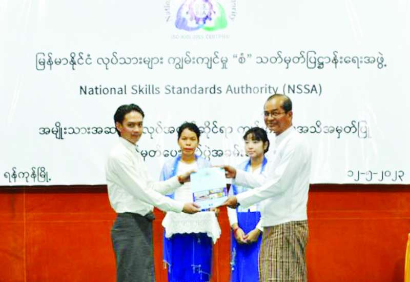 မြန်မာနိုင်ငံ လုပ်သားများကျွမ်းကျင်မှု “စံ” သတ်မှတ်ပြဋ္ဌာန်းရေးအဖွဲ့ (NSSA)၏ အမျိုးသားအဆင့်အလုပ်အကိုင်ဆိုင်ရာ ကျွမ်းကျင်မှုအသိအမှတ်ပြုလက်မှတ် ပေးအပ်ပွဲအခမ်းအနားကို မေ ၁၂ ရက်က ရန်ကုန်တိုင်းဒေသကြီး ဆောက်လုပ်ရေးဝန်ကြီးဌာန ဗဟိုသင်တန်းကျောင်း (သုဝဏ္ဏ)ခန်းမ၌ ကိုဗစ်- ၁၉ ဆိုင်ရာ စည်းမျဉ်းစည်းကမ်းများနှင့်အညီ ကျင်းပသည်။