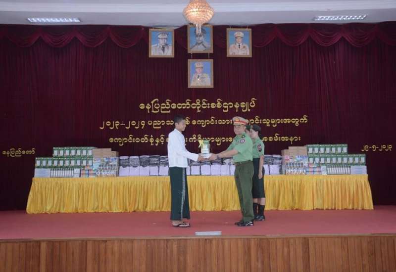 ၂၀၂၃-၂၀၂၄ ပညာသင်နှစ်တွင် တက်ရောက်ပညာသင်ကြားကြမည့် ကျောင်းသား၊ ကျောင်းသူများအား ကျောင်းဝတ်စုံနှင့် စာရေးကိရိယာများ ပေးအပ်ခြင်းကို ယနေ့နံနက်ပိုင်းတွင် နေပြည်တော်တိုင်းစစ်ဌာနချုပ်၊ အောင်ငြိမ်းအေးခန်းမ၌လည်းကောင်း၊ အရှေ့မြောက်တိုင်းစစ်ဌာနချုပ်၊ နယ်မြေခံတပ်နယ်ခန်းမ၌လည်းကောင်း၊ ရန်ကုန်တိုင်း ဒေသကြီးအစိုးရအဖွဲ့ရုံး မင်္ဂလာခန်းမ၌လည်းကောင်း၊ အနောက်တောင်တိုင်းစစ်ဌာနချုပ်၊ ပုသိမ်မြို့ရှိ ဧရာဝတီခန်းမ၌လည်းကောင်း၊ တောင်ပိုင်းတိုင်းစစ်ဌာနချုပ်၊ အေးချမ်းဖြိုးခန်းမ၌လည်းကောင်း အသီးသီးပြုလုပ်ကြရာ သက်ဆိုင်ရာ တိုင်းဒေသကြီးဝန်ကြီးချုပ်များ၊ တိုင်းစစ်ဌာနချုပ်များမှတိုင်းမှူးများနှင့် တာဝန်ရှိသူများ အရာရှိ၊ စစ်သည်၊ မိသားစုများ၊ ဆရာ၊ ဆရာမများ၊ ကျောင်းသား၊ ကျောင်းသူများ တက်ရောက်ကြသည်။