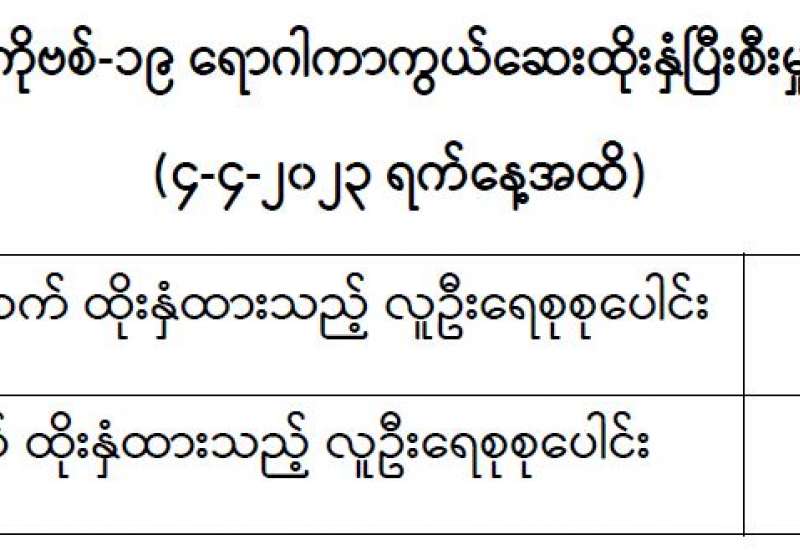 ကျန်းမာရေးဝန်ကြီးဌာနသည် COVID-19 သံသယလူနာများ၊ ဓာတ်ခွဲအတည်ပြုလူနာနှင့် အနီးကပ်ထိတွေ့ခဲ့သူများနှင့် အသွားအလာကန့်သတ်ထားရှိသူများအား COVID-19 ရောဂါ ရှိ၊ မရှိ ဓာတ်ခွဲစစ်ဆေးခြင်း ပုံမှန်ဆောင်ရွက်လျက်ရှိပြီး (၄-၄-၂၀၂၃) ရက်နေ့၊ ည (၈:၀၀) နာရီမှ (၅-၄-၂၀၂၃) ရက်နေ့၊ ည (၈:၀၀) နာရီအတွင်း ဓာတ်ခွဲနမူနာစုစုပေါင်း (၃,၈၀၆) ခုအား စစ်ဆေးပြီးစီးခဲ့ရာ COVID-19 ရောဂါ ဓာတ်ခွဲအတည်ပြုလူနာသစ် (၁) ဦး တွေ့ရှိရသဖြင့် ရောဂါပိုးတွေ့ရှိမှု ရာခိုင်နှုန်းမှာ (၀.၀၃) ရာခိုင်နှုန်း ရှိပါသည်။