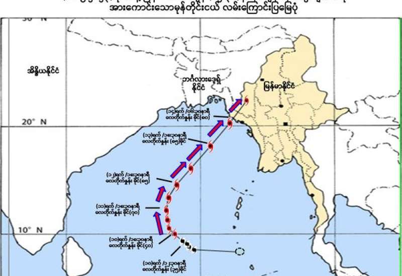 (၁) ယနေ့မြန်မာစံတော်ချိန် (၁၂:၃၀)နာရီအချိန် တိုင်းထွာချက်များအရ ဘင်္ဂလားပင်လယ်အော်အရှေ့တောင်ပိုင်းတွင်ဖြစ်ပေါ်နေသော အားကောင်းသော မုန်တိုင်းငယ်(Deep Depression)သည် အနောက်မြောက်ဘက်သို့ ရွေ့လျားခဲ့ပြီး၊ မြန်မာနိုင်ငံ၊ ကိုကိုးကျွန်းမြို့(Coco Island)၏ အနောက်တောင်ဘက် ရေမိုင်(၄၀၀)မိုင်ခန့်၊ ဟိုင်းကြီးကျွန်းမြို့(Hainggyigyun)၏ အနောက် တောင်ဘက် ရေမိုင်(၅၂၅)မိုင်ခန့်၊ စစ်တွေမြို့(Sittwe)၏ တောင်-အနောက် တောင်ဘက် ရေမိုင်(၇၀၅)မိုင်ခန့်၊ အိန္ဒိယနိုင်ငံ၊ နီကိုးဘားကျွန်း(Nicobar Islands)၏ အနောက်-အနောက်မြောက်ဘက် ရေမိုင်(၃၂၅)မိုင်ခန့်၊ ပို့ပလဲယား (Port Blair)၏ အနောက်တောင်ဘက် ရေမိုင်(၂၈၅)မိုင်ခန့်နှင့် ဘင်္ဂလားဒေ့ရှ်နိုင်ငံ၊ ကော့ဘဇားမြို့(Cox’s Bazar)၏ တောင်-အနောက်တောင်ဘက်ရေမိုင်(၇၆၀)မိုင်ခန့်အကွာ ပင်လယ်ပြင်ကို ဗဟိုပြုနေပါသည်။