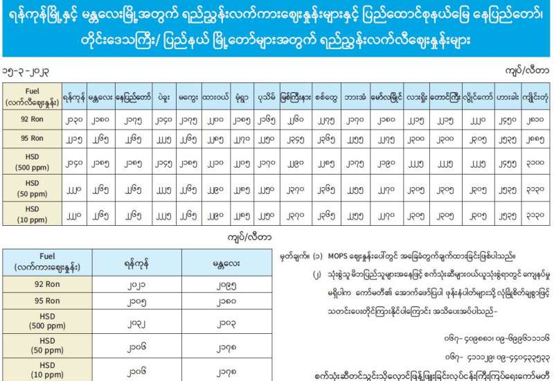 ရန်ကုန်မြို့နှင့် မန္တလေးမြို့အတွက် ရည်ညွှန်းလက်ကားဈေးနှုန်းများနှင့် ပြည်ထောင်စုနယ်မြေ နေပြည်တော်၊ တိုင်းဒေသကြီး/ပြည်နယ် မြို့တော်များအတွက် ရည်ညွှန်းလက်လီဈေးနှုန်းများ