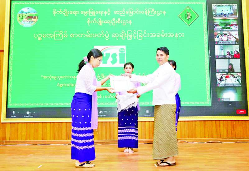 “အသုံးချသုတေသနများမှသည် ဖွံ့ဖြိုးတိုးတက်သော စိုက်ပျိုးရေးကဏ္ဍဆီသို့” ခေါင်းစဉ်ဖြင့် ကျင်းပသည့် စိုက်ပျိုးရေးဦးစီးဌာန၏ (၅)ကြိမ်မြောက် စာတမ်းဖတ်ပွဲ ဆုချီးမြှင့်ပွဲ အခမ်းအနားကို ယနေ့နံနက်ပိုင်းက စိုက်ပျိုးရေး၊ မွေးမြူရေးနှင့် ဆည်မြောင်းဝန်ကြီးဌာန ပြည်ထောင်စုဝန်ကြီးရုံး စုဝေးဆောင်ခန်းမ၌ ကျင်းပသည်။