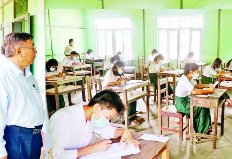 ပညာရေးဝန်ကြီးဌာန ပြည်ထောင်စုဝန်ကြီး ဒေါက်တာညွန့်ဖေသည် ဧရာဝတီတိုင်းဒေသကြီး ဝန်ကြီးချုပ် ဦးတင်မောင်ဝင်း၊ အနောက်တောင်တိုင်းစစ်ဌာနချုပ် တိုင်းမှူး ဗိုလ်မှူးချုပ်ကြည်ခိုင်နှင့်အတူ ယနေ့နံနက်ပိုင်းတွင် ဧရာဝတီတိုင်းဒေသကြီး ပုသိမ်မြို့ အမှတ်(၇) အခြေခံပညာအထက်တန်းကျောင်းရှိ ၂၀၂၃ နှစ် တက္ကသိုလ်ဝင်တန်း စာမေးပွဲစာစစ်ဌာနသို့ ရောက်ရှိပြီး တက္ကသိုလ်ဝင်စာမေးပွဲ ပထမနေ့ မြန်မာစာဘာသာ ဖြေဆိုနေမှုများကို လှည့်လည်ကြည့်ရှုအားပေးသည်။