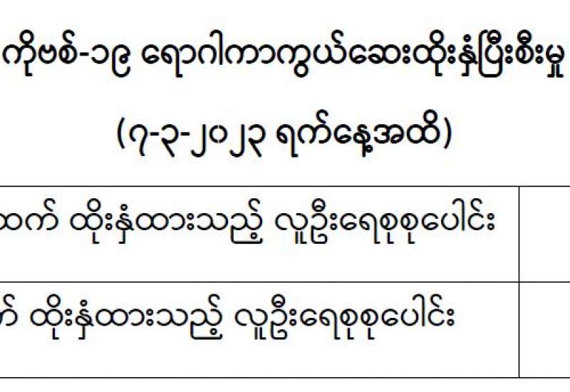 ကျန်းမာရေးဝန်ကြီးဌာနသည် COVID-19 သံသယလူနာများ၊ ဓာတ်ခွဲအတည်ပြုလူနာနှင့် အနီးကပ်ထိတွေ့ခဲ့သူများနှင့် အသွားအလာကန့်သတ်ထားရှိသူများအား COVID-19 ရောဂါ ရှိ၊ မရှိ ဓာတ်ခွဲစစ်ဆေးခြင်း ပုံမှန်ဆောင်ရွက်လျက်ရှိပြီး (၇-၃-၂၀၂၃) ရက်နေ့၊ ည (၈:၀၀) နာရီမှ (၈-၃-၂၀၂၃) ရက်နေ့၊ ည (၈:၀၀) နာရီအတွင်း ဓာတ်ခွဲနမူနာစုစုပေါင်း (၃,၄၇၄) ခုအား စစ်ဆေးပြီးစီးခဲ့ရာ COVID-19 ရောဂါ ဓာတ်ခွဲအတည်ပြုလူနာသစ် မတွေ့ရှိရပါ။