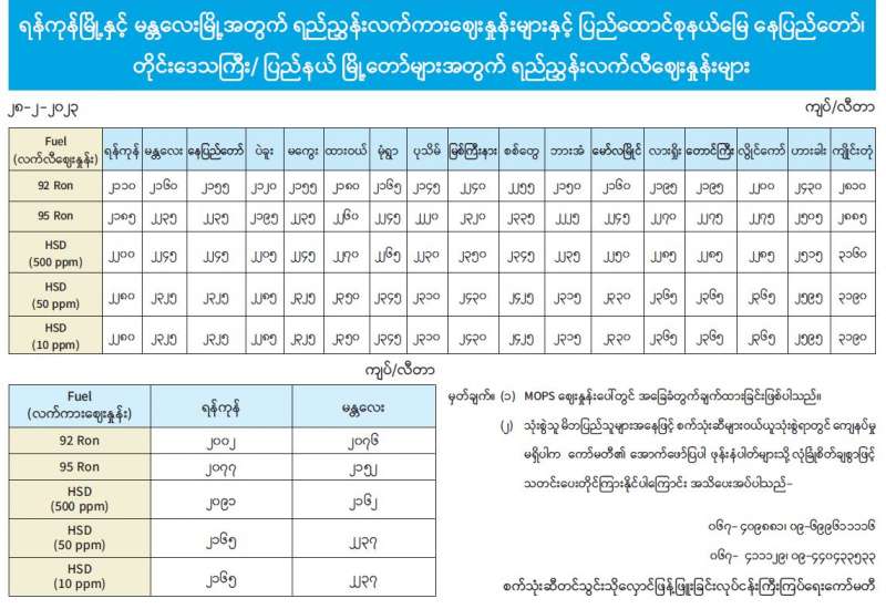 ရန်ကုန်မြို့နှင့် မန္တလေးမြို့အတွက် ရည်ညွှန်းလက်ကားဈေးနှုန်းများနှင့် ပြည်ထောင်စုနယ်မြေ နေပြည်တော်၊ တိုင်းဒေသကြီး/ ပြည်နယ် မြို့တော်များအတွက် ရည်ညွှန်းလက်လီဈေးနှုန်းများ