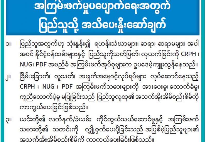 နိုင်ငံတော်အစိုးရမှ အကြမ်းဖက်အုပ်စုအဖြစ်ကြေညာထားသည့် CRPH ၊ NUG နှင့် PDF အမည်ခံအကြမ်းဖက်အုပ်စုများသည် ပြည်သူအတွက်ဟုသုံးနှုန်း၍ ရဟန်းသံဃာများ၊ ဆရာ၊ ဆရာမများအပါအဝင် နိုင်ငံ့ဝန်ထမ်းများနှင့် အပြစ်မဲ့ပြည်သူများကို သတ်ဖြတ်ခြင်း၊ လုယက်ခြင်းများအား ဥပဒေမဲ့ကျူးလွန်လျက်ရှိသည်။ ထို့အပြင် CRPH နှင့် NUG တို့သည် တိုင်းရင်းသားလက်နက်ကိုင်အဖွဲ့အချို့နှင့်ချိတ်ဆက်၍ လက်နက်/ခဲယမ်းများဝယ်ယူကာ PDF အမည်ခံအကြမ်းဖက်သမားများအားထောက်ပံ့၍ အပြစ်မဲ့ပြည်သူများအပေါ် ခြိမ်းခြောက်ခြင်း၊ လူသတ်ခြင်းနှင့် အဖျက်အမှောင့်လုပ်ငန်းများ လုပ်ဆောင်ခြင်းတို့ကို ဆောင်ရွက်လျက်ရှိသည်။