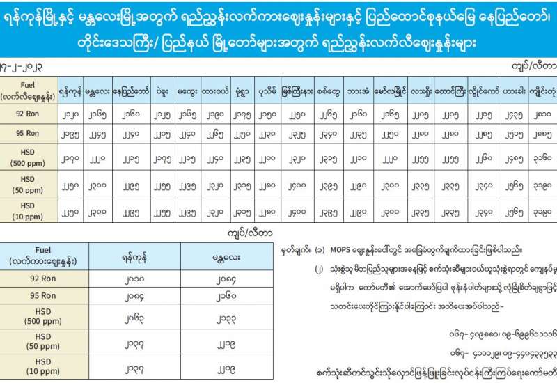 ရန်ကုန်မြို့နှင့် မန္တလေးမြို့အတွက် ရည်ညွှန်းလက်ကားဈေးနှုန်းများနှင့် ပြည်ထောင်စုနယ်မြေ နေပြည်တော်၊ တိုင်းဒေသကြီး/ ပြည်နယ် မြို့တော်များအတွက် ရည်ညွှန်းလက်လီဈေးနှုန်းများ