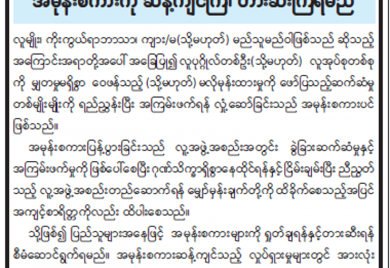 သာသနာရေးနှင့် ယဉ်ကျေးမှုဝန်ကြီးဌာနကကျင်းပသော ဒုတိယအကြိမ် သုံးဆယ့်ရှစ်ဖြာမင်္ဂလာ ယဉ်ကျေးလိမ္မာသင်တန်း ဖွင့်ပွဲအခမ်းအနားကို ယနေ့နံနက် ၉ နာရီတွင် နေပြည်တော် ရုံးအမှတ် (၃၁) သာသနာရေးနှင့် ယဉ်ကျေးမှုဝန်ကြီးဌာန စုပေါင်းအစည်းအဝေးခန်းမ၌ ကျင်းပသည်။