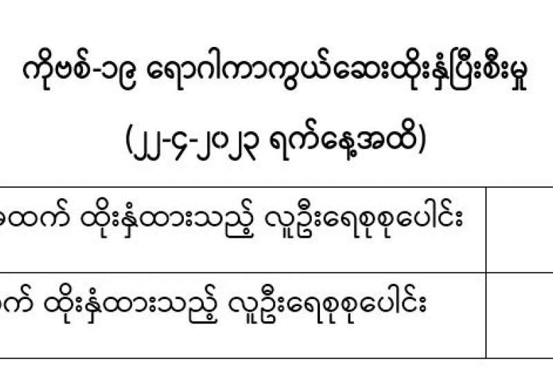 ကျန်းမာရေးဝန်ကြီးဌာနသည် COVID-19 သံသယလူနာများ၊ ဓာတ်ခွဲအတည်ပြုလူနာနှင့် အနီးကပ်ထိတွေ့ခဲ့သူများနှင့် အသွားအလာကန့်သတ်ထားရှိသူများအား COVID-19 ရောဂါ ရှိ၊ မရှိ ဓာတ်ခွဲစစ်ဆေးခြင်း ပုံမှန်ဆောင်ရွက်လျက်ရှိပြီး (၂၂-၄-၂၀၂၃) ရက်နေ့၊ ည (၈:၀၀) နာရီမှ (၂၃-၄-၂၀၂၃) ရက်နေ့၊ ည (၈:၀၀) နာရီအတွင်း ဓာတ်ခွဲနမူနာစုစုပေါင်း (၆,၀၇၇) ခုအား စစ်ဆေးပြီးစီးခဲ့ရာ COVID-19 ရောဂါ ဓာတ်ခွဲ အတည်ပြုလူနာသစ် (၄၅) ဦး တွေ့ရှိရပါသည်။ ထို့ကြောင့် ယနေ့အတွက် ရောဂါပိုးတွေ့ရှိမှု ရာခိုင်နှုန်းမှာ (၀.၇၄) ရာခိုင်နှုန်း ရှိပါသည်။