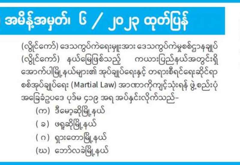 စစ်အုပ်ချုပ်ရေး (Martial Law) အမိန့်အမှတ်၊ ၆ / ၂၀၂၃ ထုတ်ပြန်