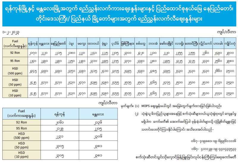 ရန်ကုန်မြို့နှင့် မန္တလေးမြို့အတွက် ရည်ညွှန်းလက်ကားဈေးနှုန်းများနှင့် ပြည်ထောင်စုနယ်မြေ နေပြည်တော်၊ တိုင်းဒေသကြီး/ ပြည်နယ် မြို့တော်များအတွက် ရည်ညွှန်းလက်လီဈေးနှုန်းများ